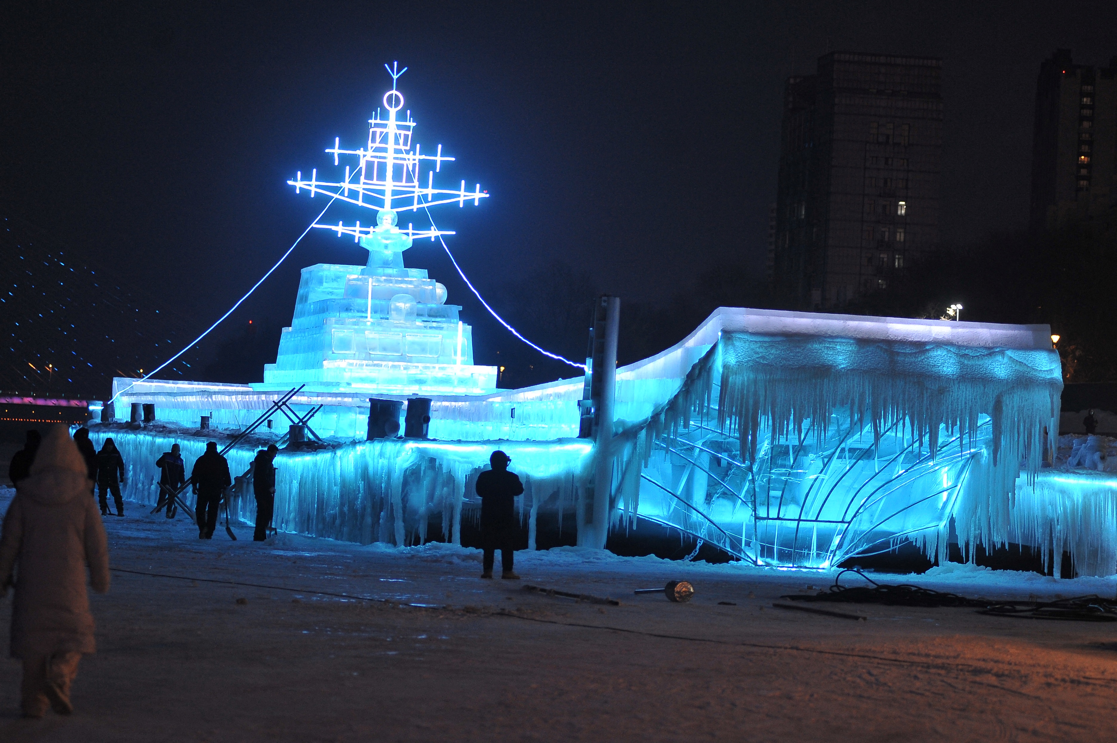 This photo taken on January 2, 2025 shows an ice-sculpted replica of China's first domestically-built Liaoning aircraft carrier in Harbin, northeastern China's Heilongjiang province. (Photo by AFP Photo/China Stringer Network)