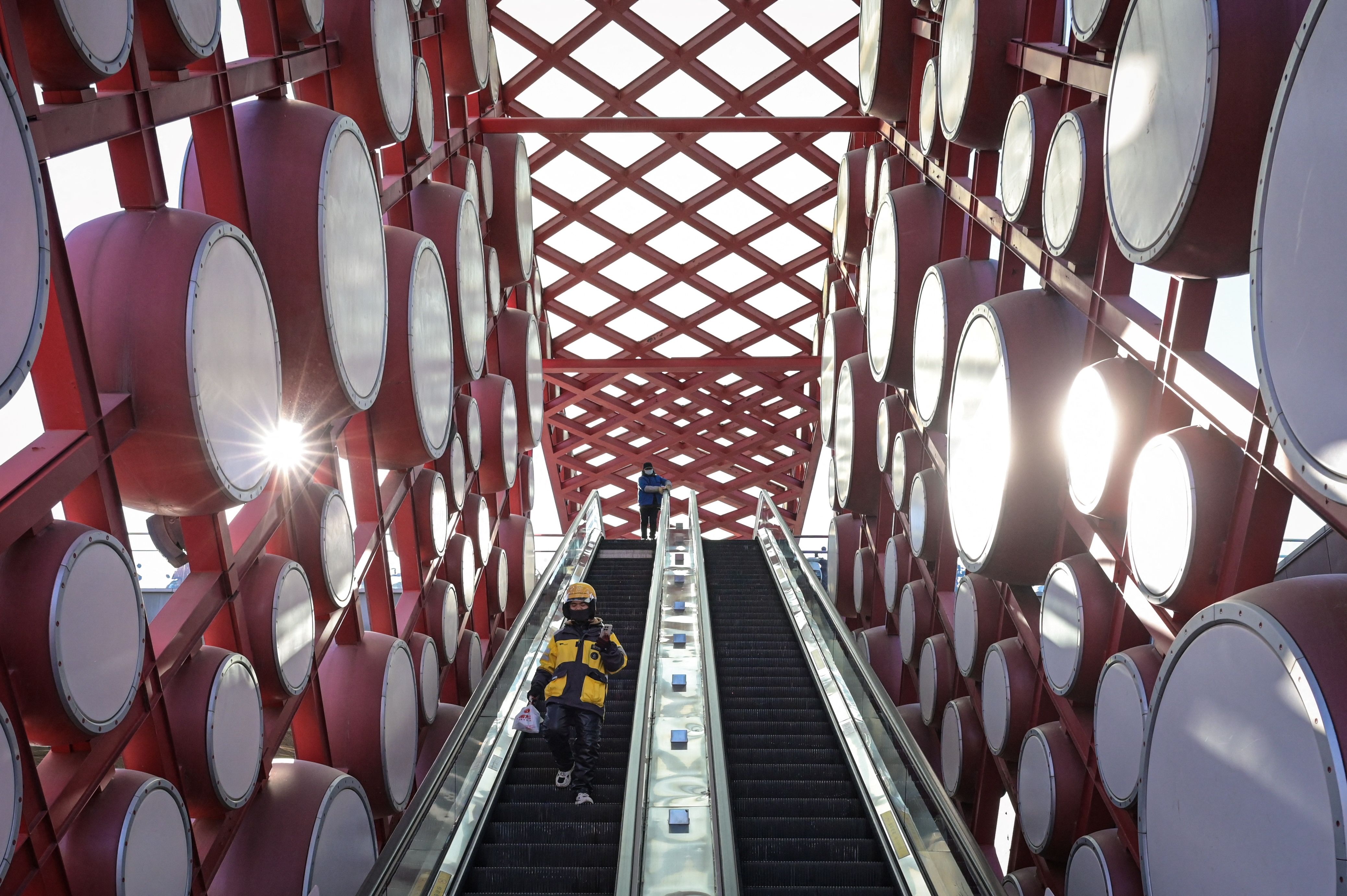 People take an escalator amid an installation of drums in Beijing on January 3, 2025. (Photo by Jade Gao/AFP Photo)