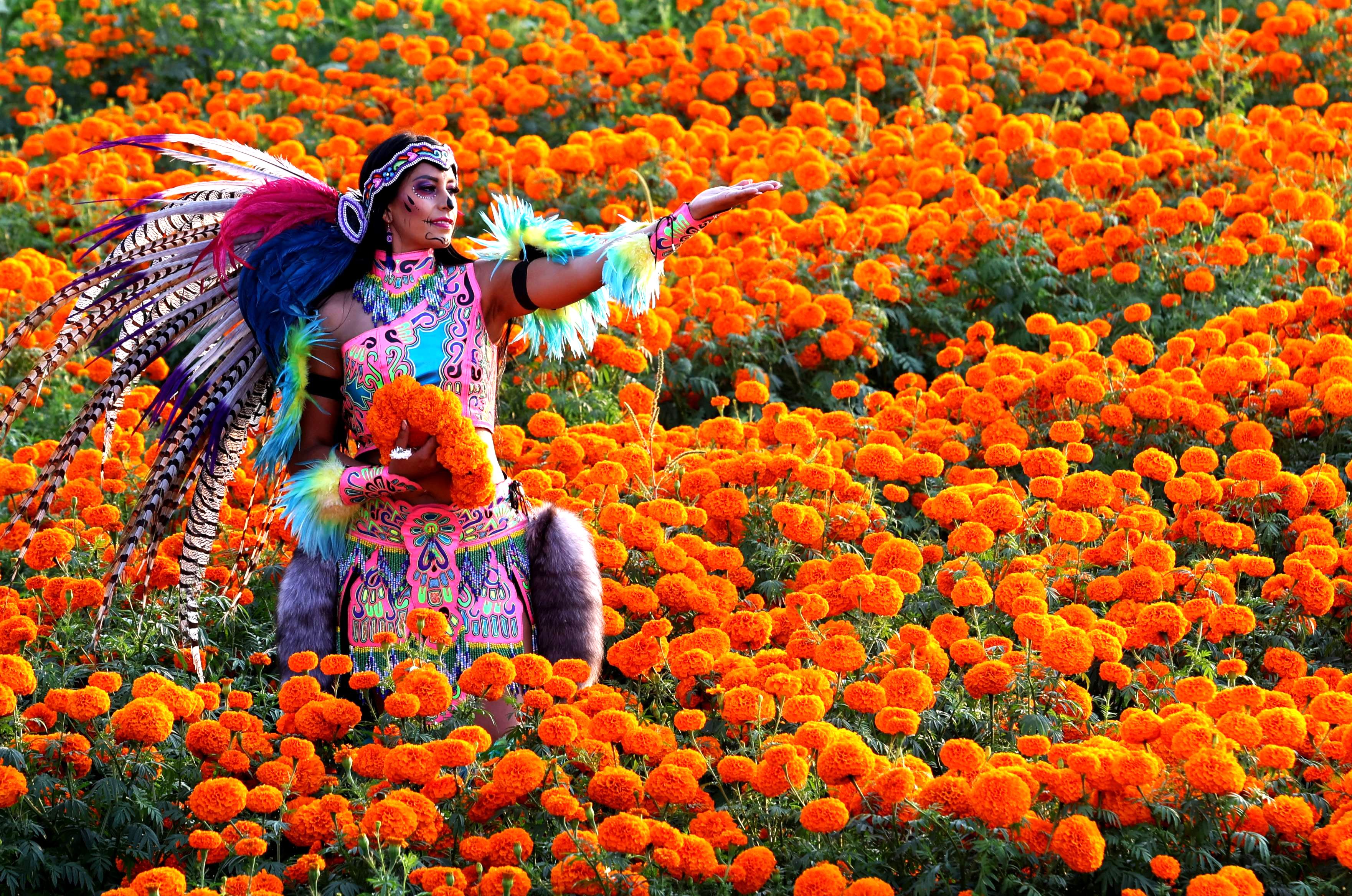 A woman dressed as a pre-Hispanic Catrina poses for a photograph in a field of Cempazuchitl flowers – Mexican Marigold (Tagetes erecta) – as part of the preparations for the Day of the Dead celebration in Tlajomulco de Zuñiga, Jalisco state, Mexico on October 26, 2023. (Photo by Ulises Ruiz/AFP Photo)