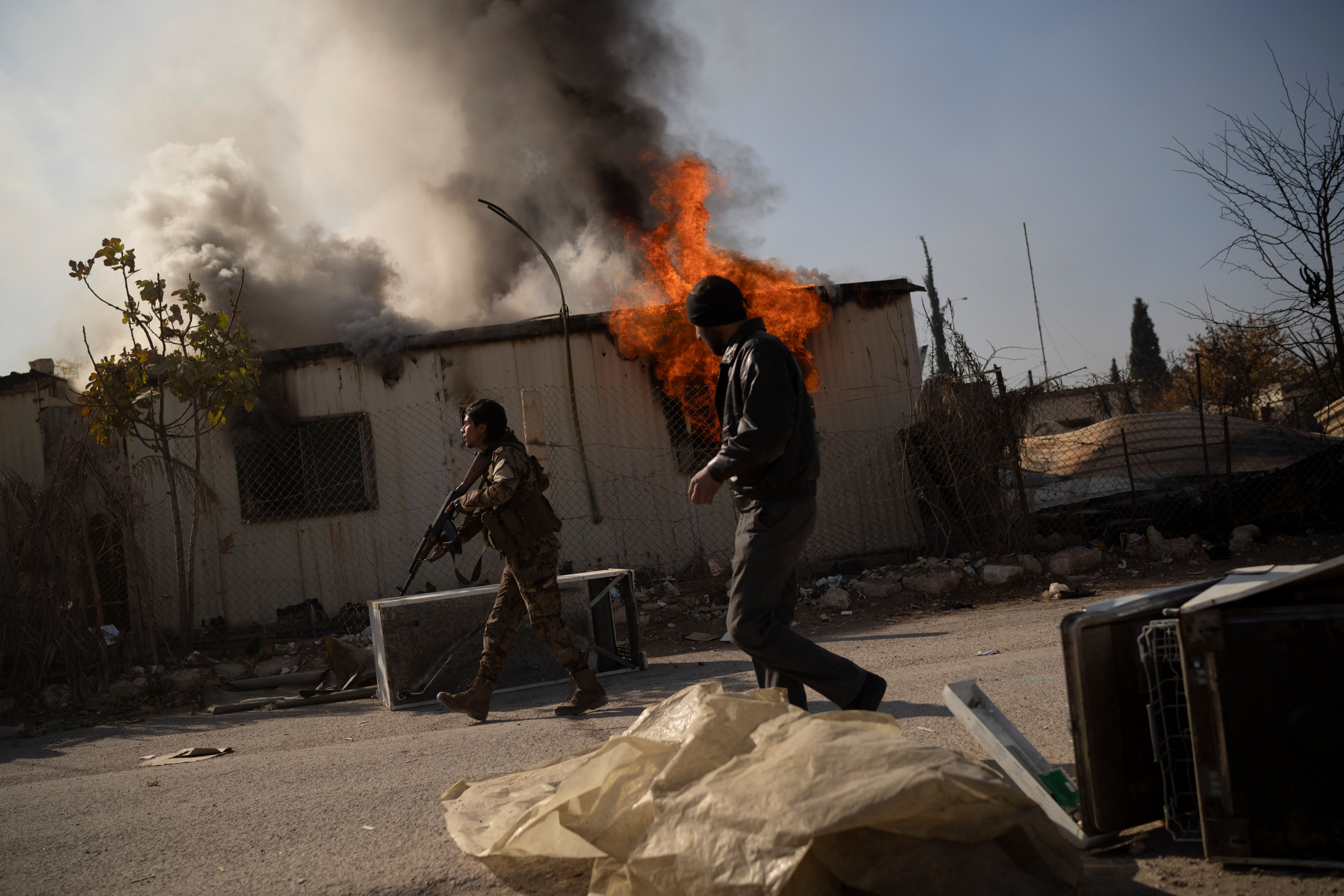 A Syrian fighter carries his weapon past a burning house during a raid to stop looters who swarmed a residential complex of former Bashar Assad's military officers and set some apartments on fire at the village of Husseiniyeh, in the outskirts of Damascus, Syria, Sunday, December 15, 2024. (Photo by Leo Correa/AP Photo)