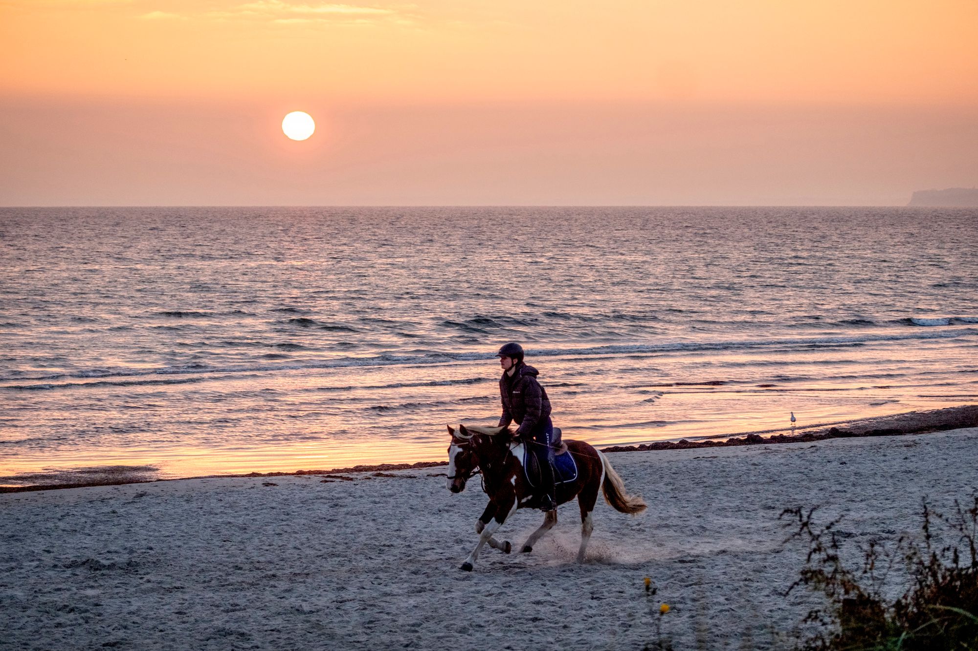 A young woman rides her horse along the Baltic Sea in Haffkrug, northern Germany, as the sun rises on Friday, October 25, 2024. (Photo by Michael Probst/AP Photo)