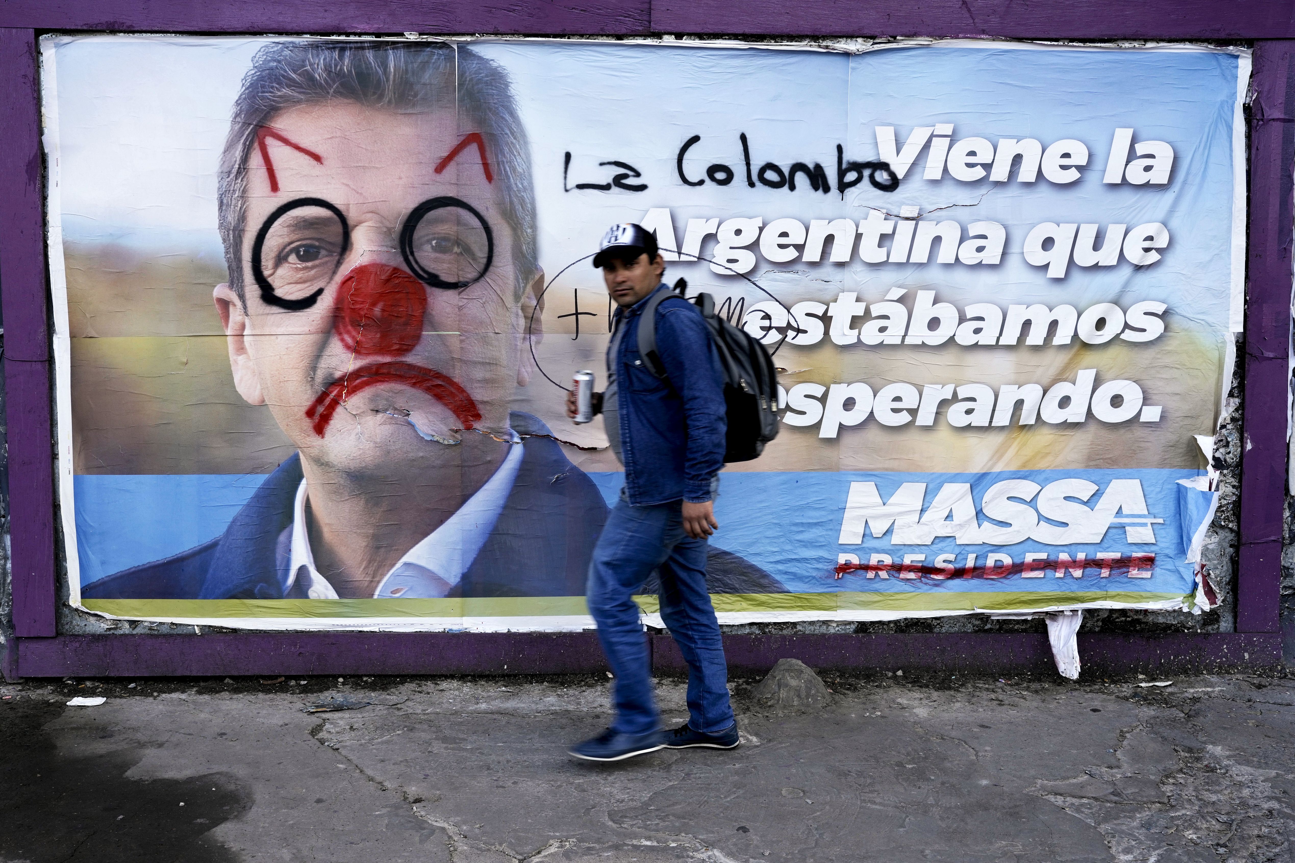 A man walks past a defaced poster of Economy Minster Sergio Massa, presidential candidate for the ruling party, in Buenos Aires, Argentina, Saturday, November 18, 2023. Massa will face Liberty Advances coalition candidate Javier Milei in a runoff election on Nov. 19. (Photo by Rodrigo Abd/AP Photo)
