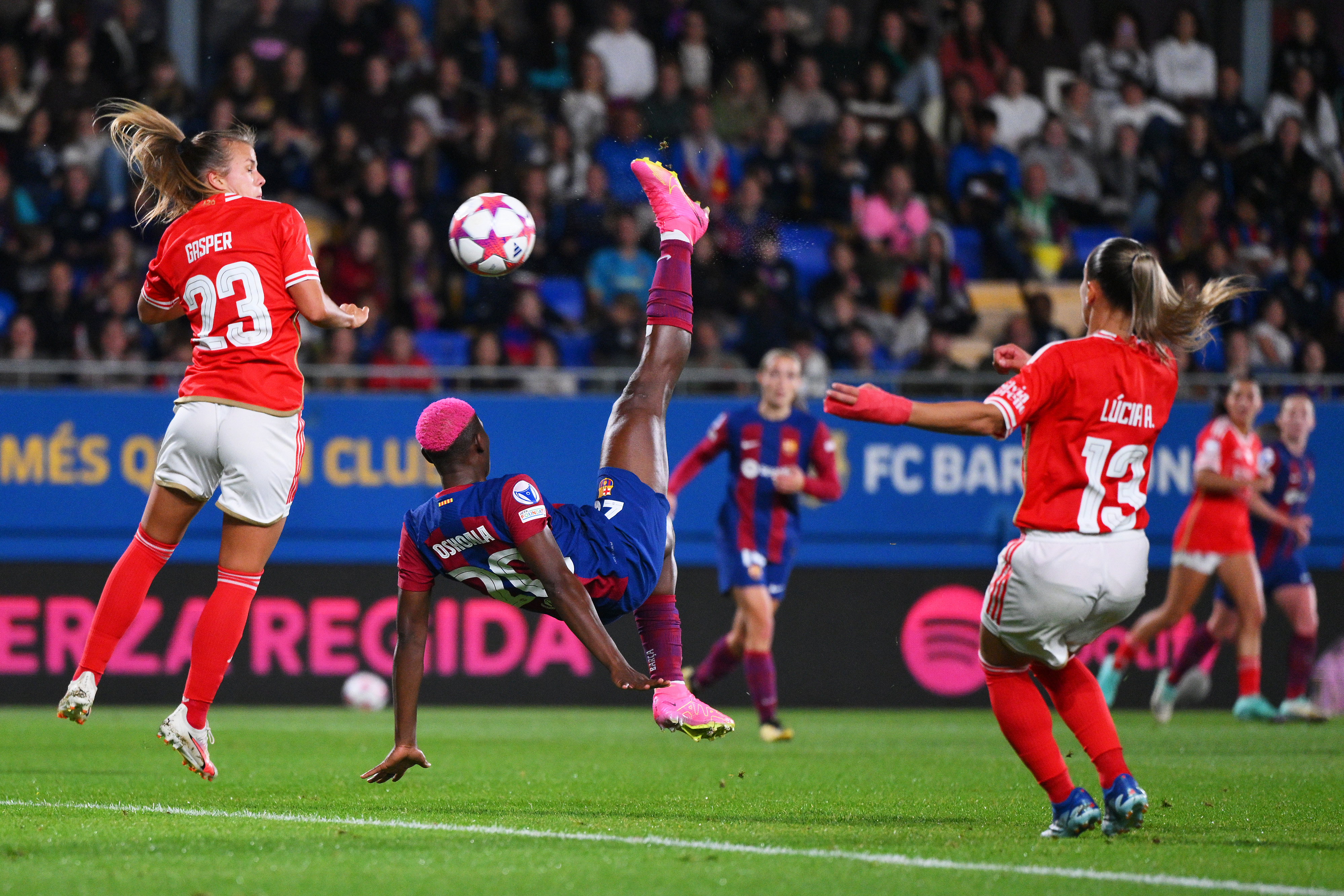 Asisat Oshoala scores during the match between FC Barcelona and SL Benfica, corresponding to the week 1 of the UEFA Womens Champions League, played at the Johan Cruyff Stadium, on 14th November 2023, in Barcelona, Spain. (Photo by Joan Valls/Urbanandsport/NurPhoto via Getty Images)