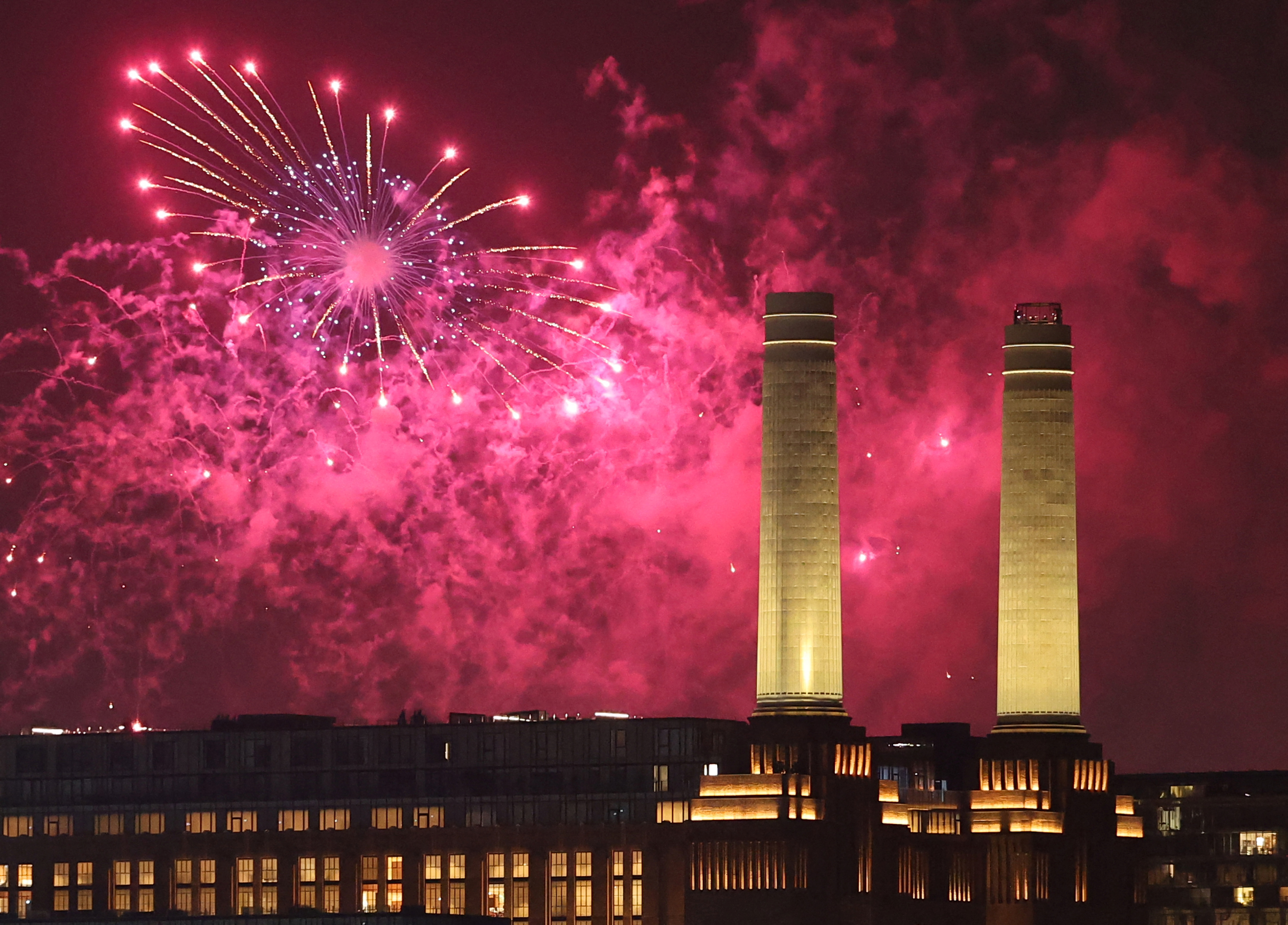 Fireworks, to mark bonfire night and the anniversary of Guy Fawkes gunpowder plot of 1605 to blow up the Houses of Parliament, explode behind chimneys of Battersea Power Station in London, Britain on November 4, 2023. (Photo by Toby Melville/Reuters)