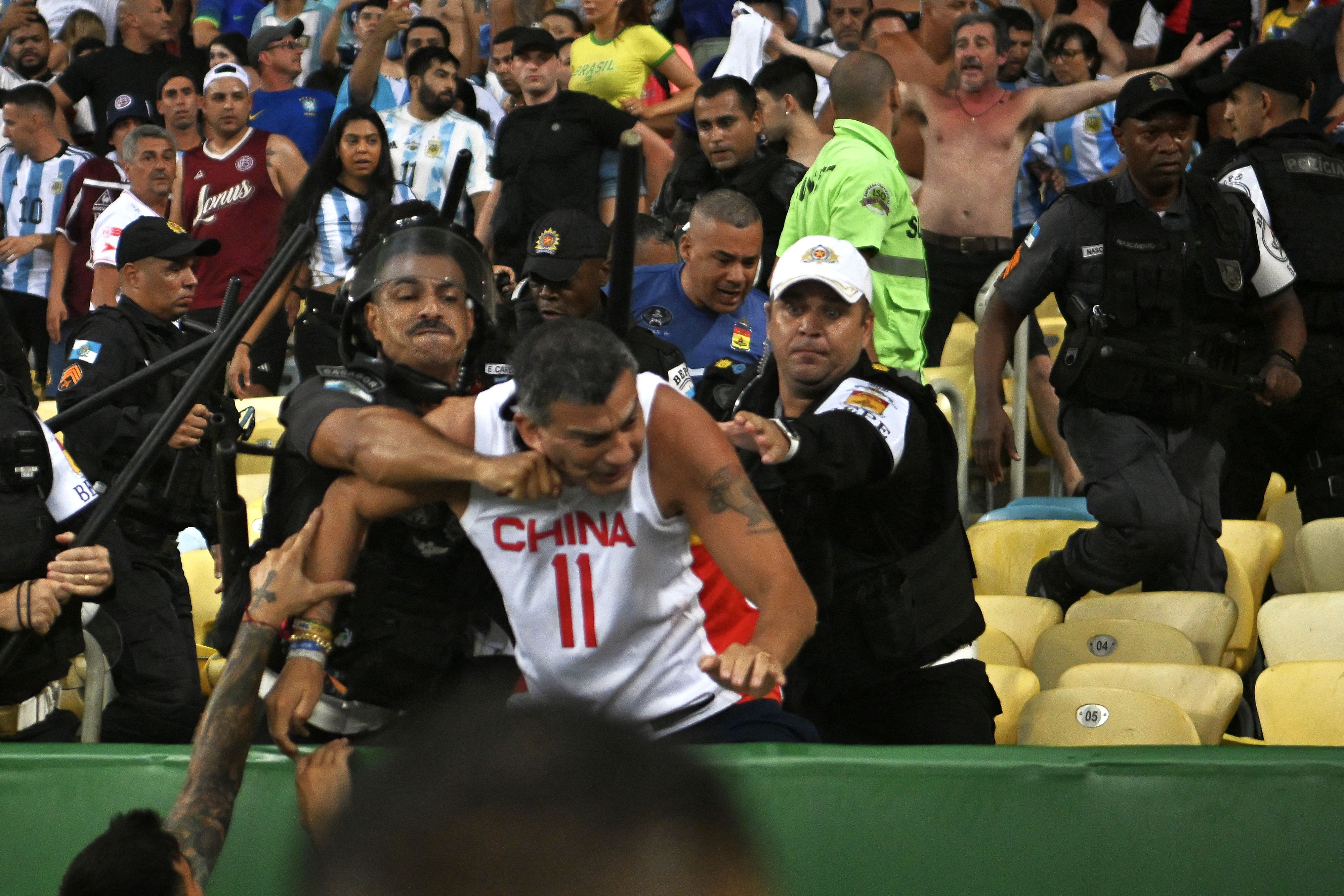 Fans of Argentina clash with Brazilian police before the start of the 2026 FIFA World Cup South American qualification football match between Brazil and Argentina at Maracana Stadium in Rio de Janeiro, Brazil, on November 21, 2023. (Photo by Carl de Souza/AFP Photo)
