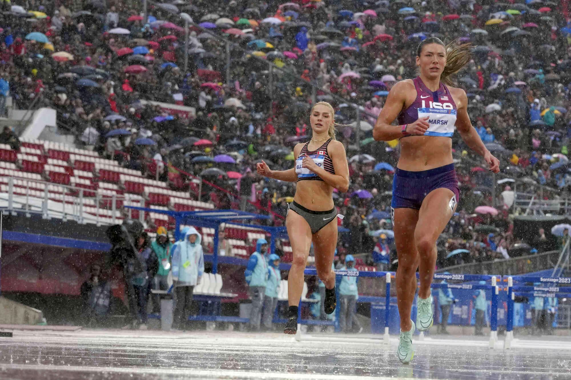 Erin Marsh of the United States and Canada's Georgia Ellenwood compete in the women's heptathlon 100-meters hurdles at the Pan American Games in Santiago, Chile, Wednesday, November 1, 2023. (Photo by Natacha Pisarenko/AP Photo)