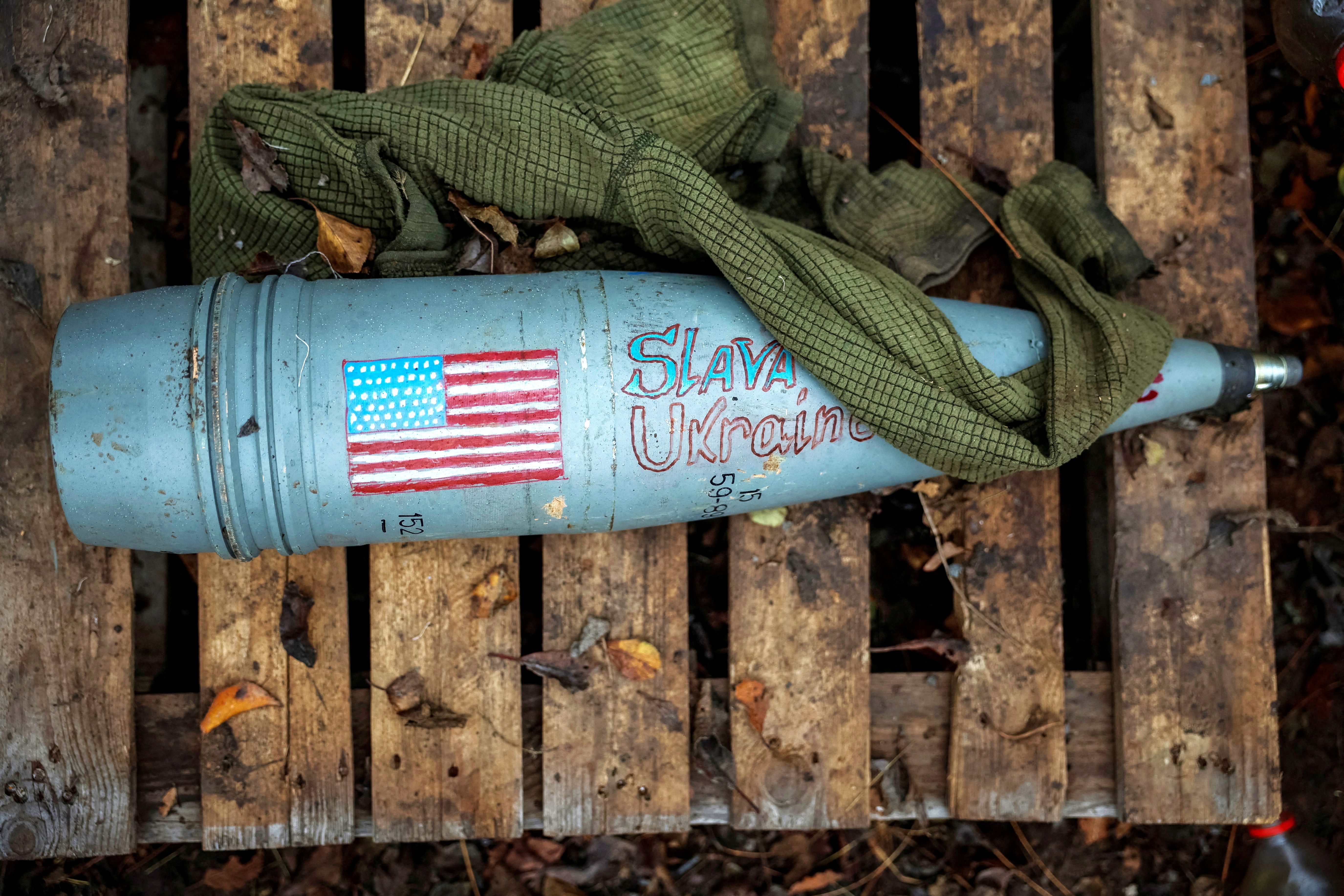A shell with a painted American flag appears side of a Giatsint-B howitzer at a position near a frontline, amid Russia's attack on Ukraine, at an undisclosed location in Donetsk region, Ukraine on November 4, 2023. (Photo by Alina Smutko/Reuters)
