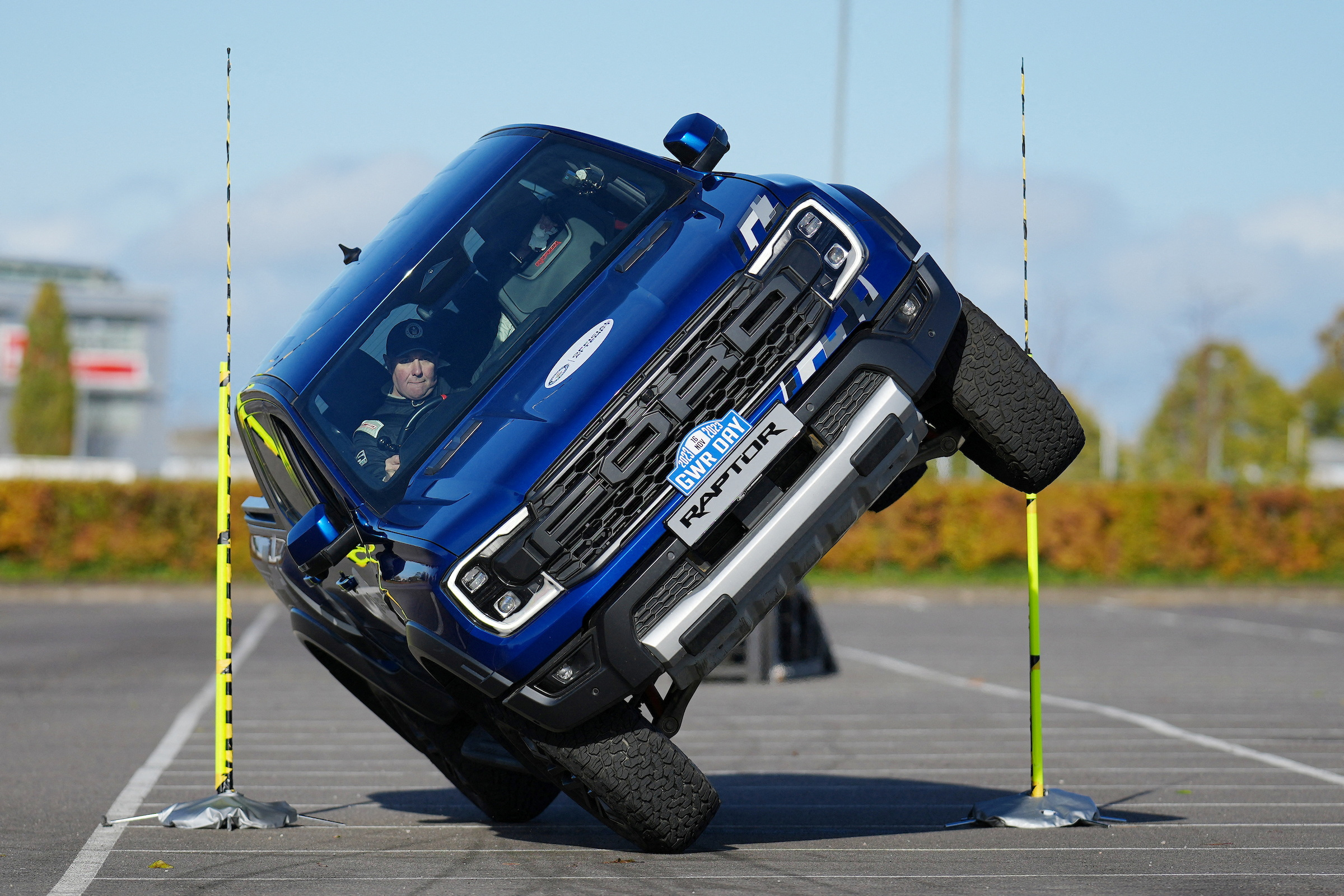 Paul Swift achieves the Guinness World Record for 'The tightest gap (44cm) driven through on two wheels in a pick up truck' in Silverstone, Britain on November 9, 2023. (Photo by Guinness World Records Day 2023/Handout via Reuters)