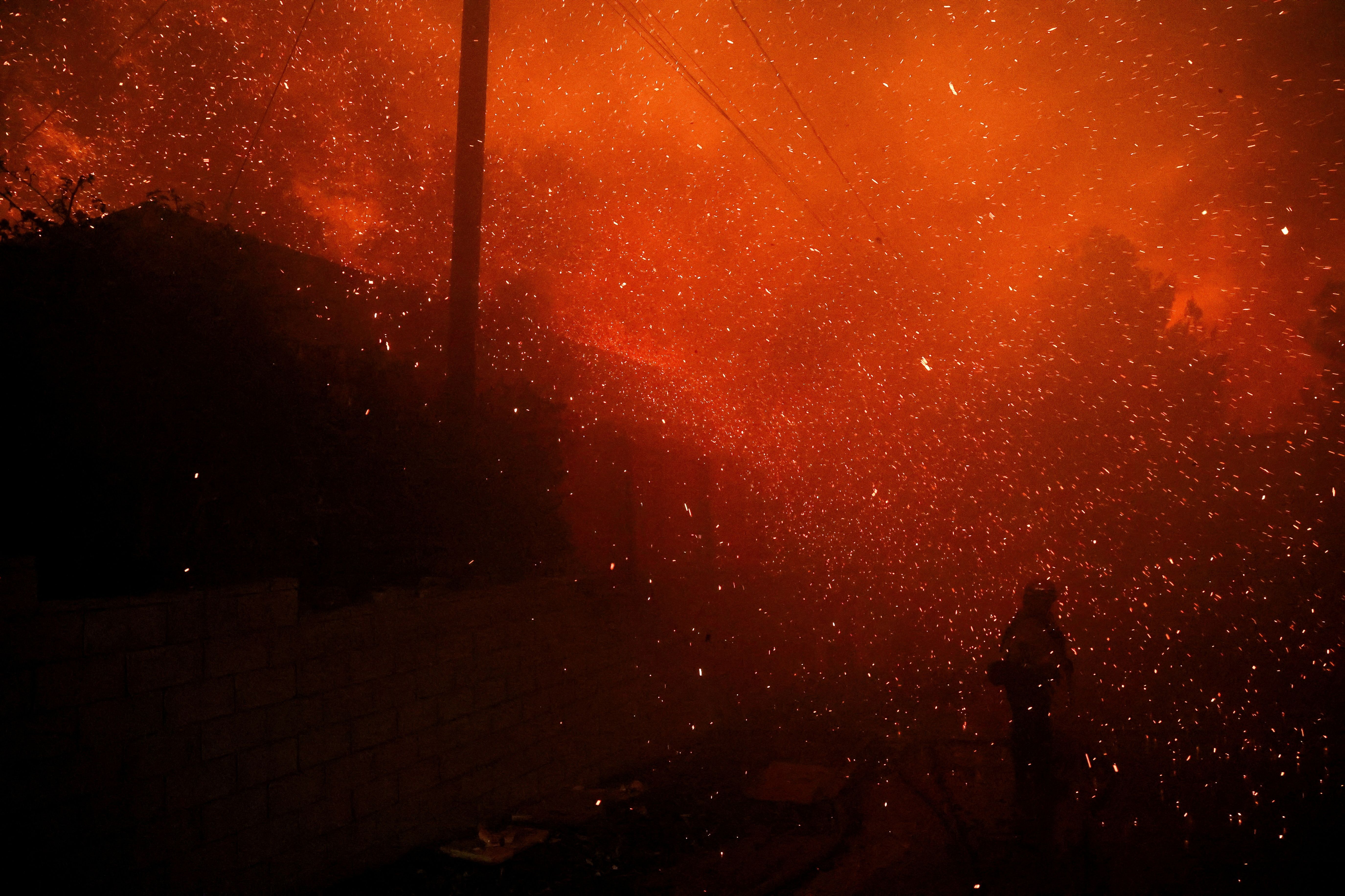 A firefighter stands among flying sparks as the Eaton Fire burns in Pasadena, California, U.S. January 7, 2025. (Photo by Mario Anzuoni/Reuters)