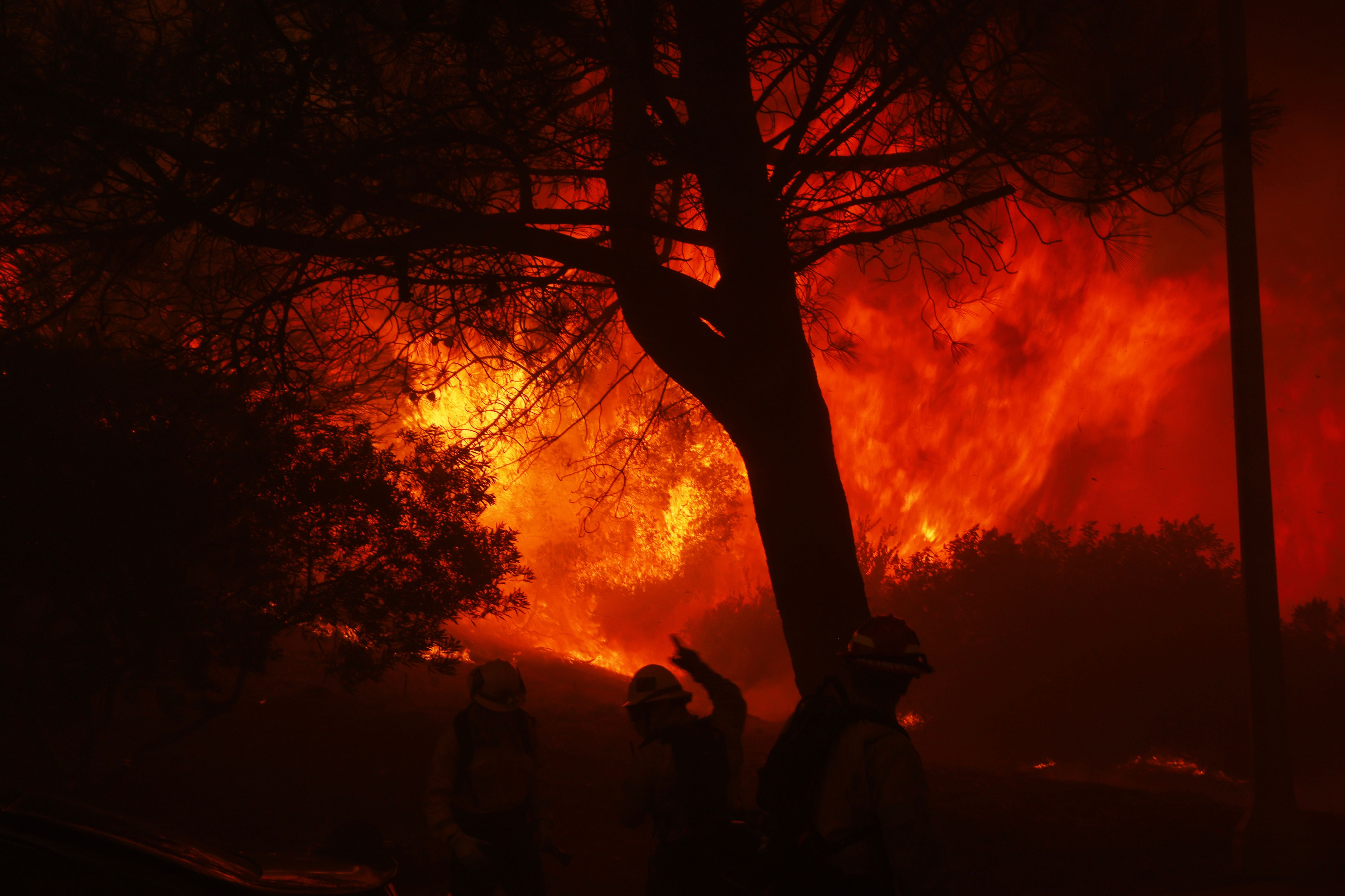 Firefighters stage in front of the advancing Palisades Fire in the Pacific Palisades neighborhood of Los Angeles, Tuesday, January 7, 2025. (Photo by Etienne Laurent/AP Photo)