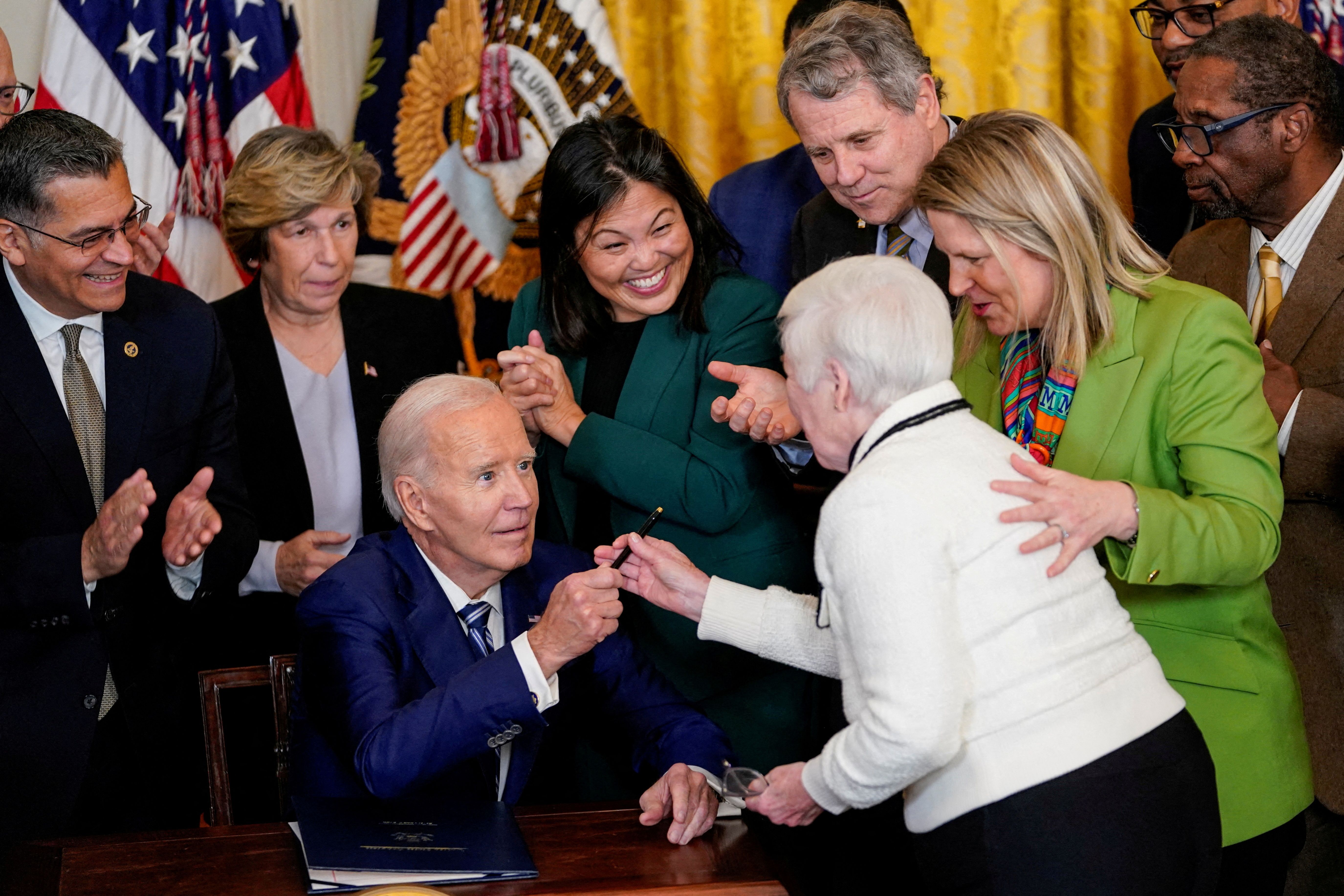 U.S. President Joe Biden hands a pen to Bette Marafino, President of the Connecticut Chapter of the Alliance for Retired Americans, as they participate in a bill signing ceremony for the “Social Security Fairness Act” in the East Room of the White House, in Washington, U.S. January 5, 2025. (Photo by Nathan Howard/Reuters)