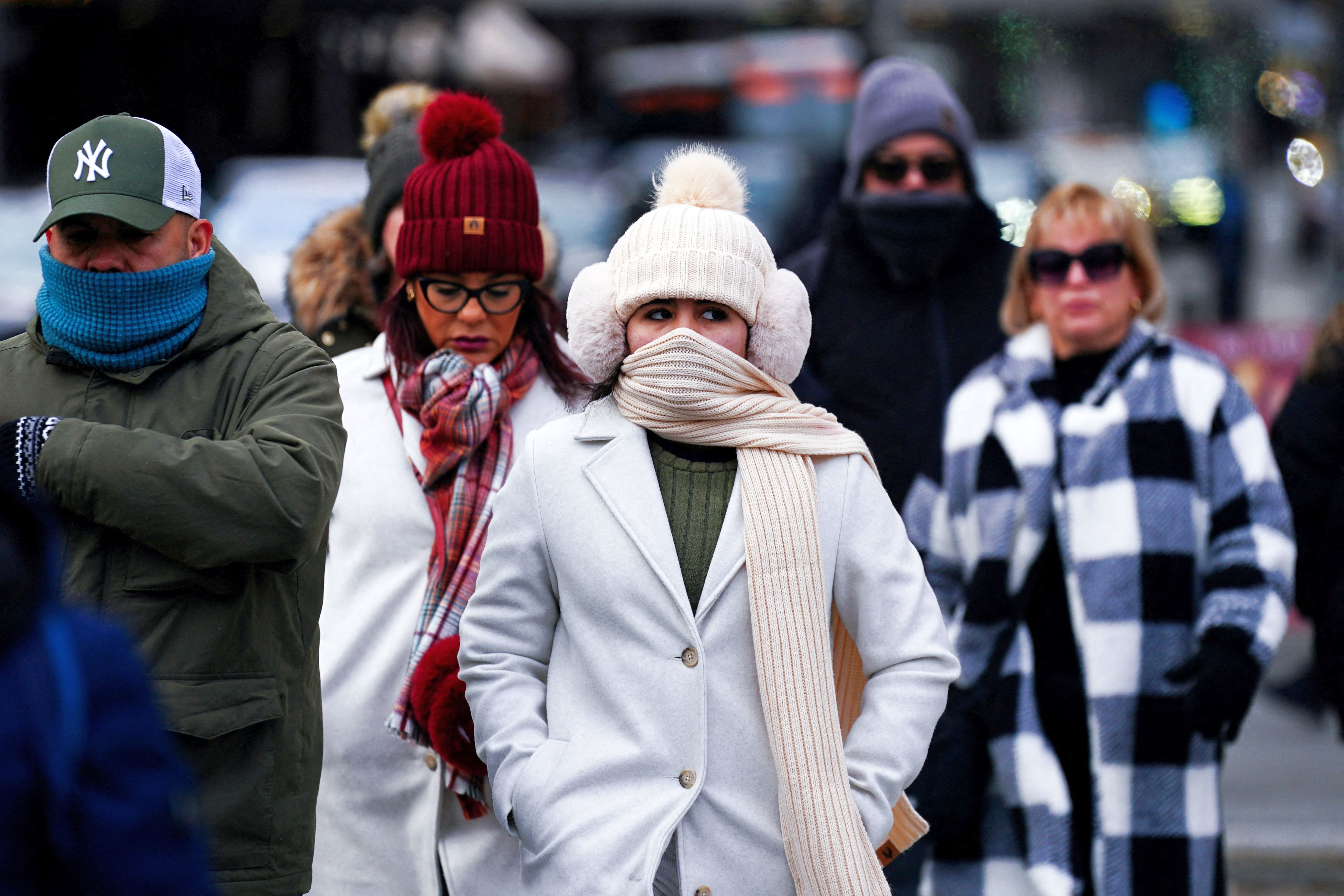 People cross the street in Manhattan during cold weather in New York City on January 5, 2025. (Photo by Adam Gray/Reuters)