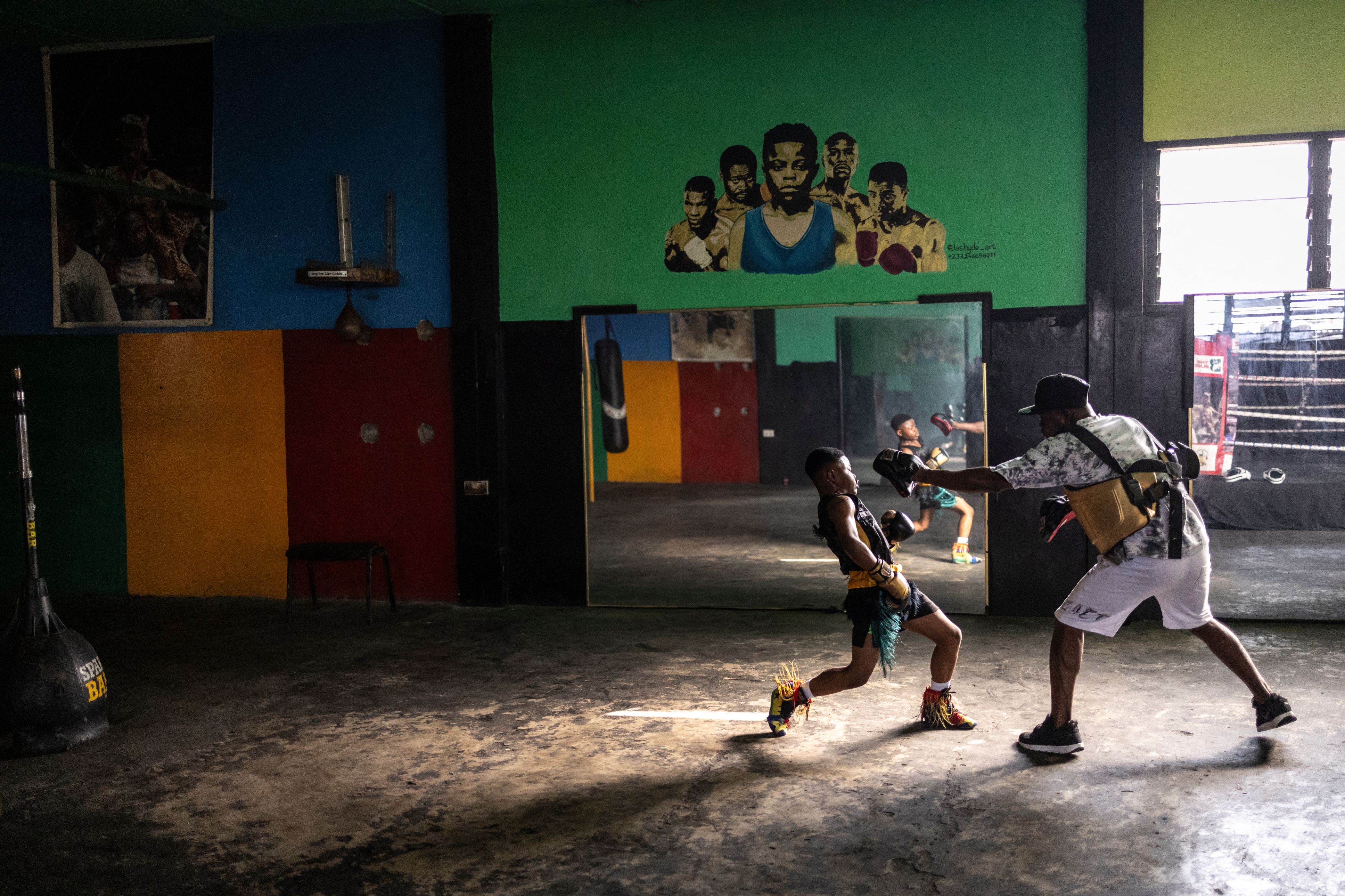 Professional boxer Prince Larbi (L), also known as Prince The Buzz Larbi, trains with his dad and coach Daniel Larbi (R) at Will Power Boxing Gym in the Jamestown neighbourhood of Accra on December 10, 2024. (Photo by Olympia de Maismont/AFP Photo)