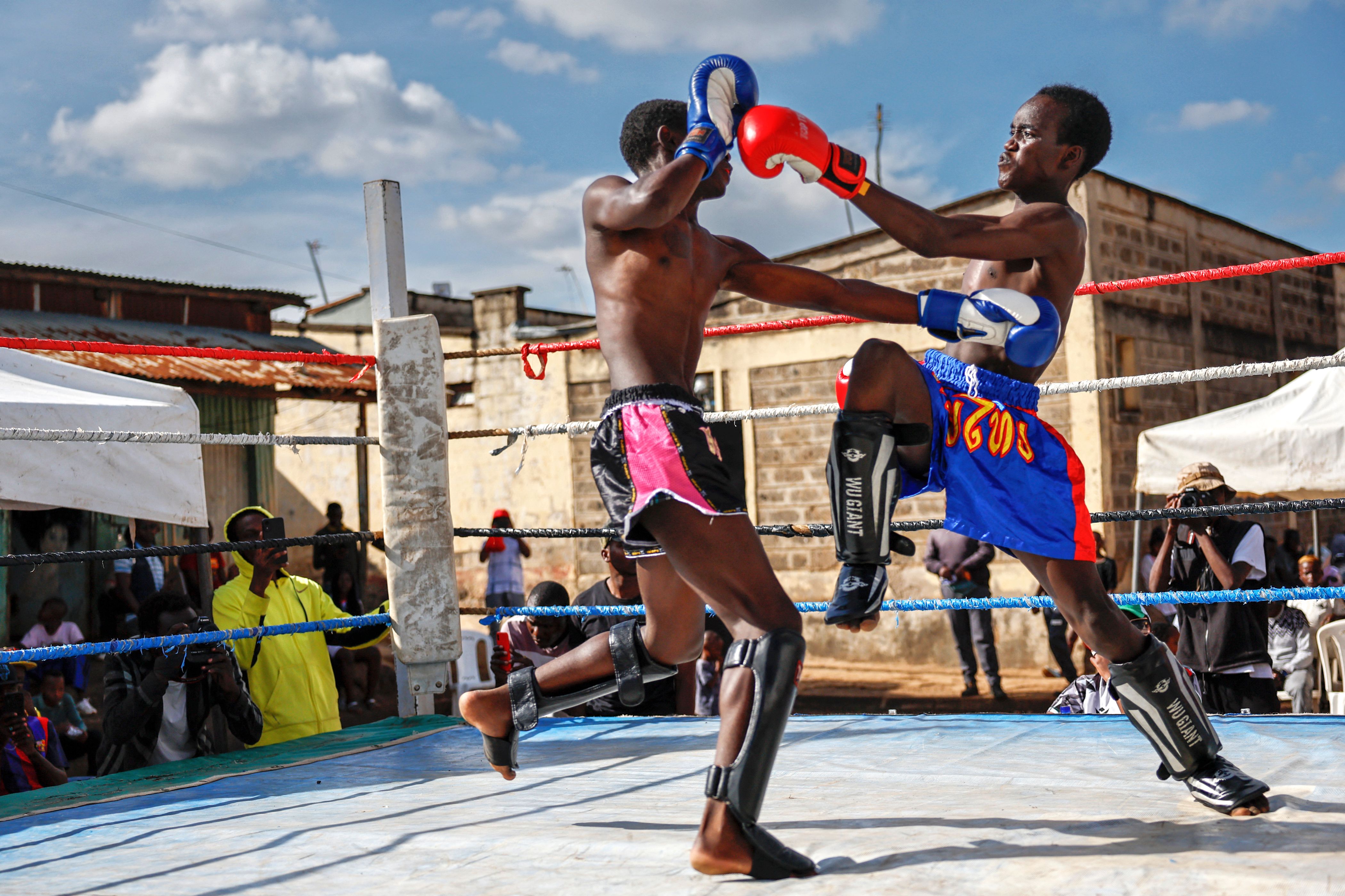 Muay Thai participants, fight during the Kibra Youth Initiative boxing exhibition at the Kibera Fort Jesus grounds in Nairobi on December 23, 2024. The purpose of the boxing exhibition is to promote boxing and Muay Thai in the local communities and help prevention of crime and substance abuse among the growing youth within the area and surrounding communities. (Photo by Simon Maina/AFP Photo)