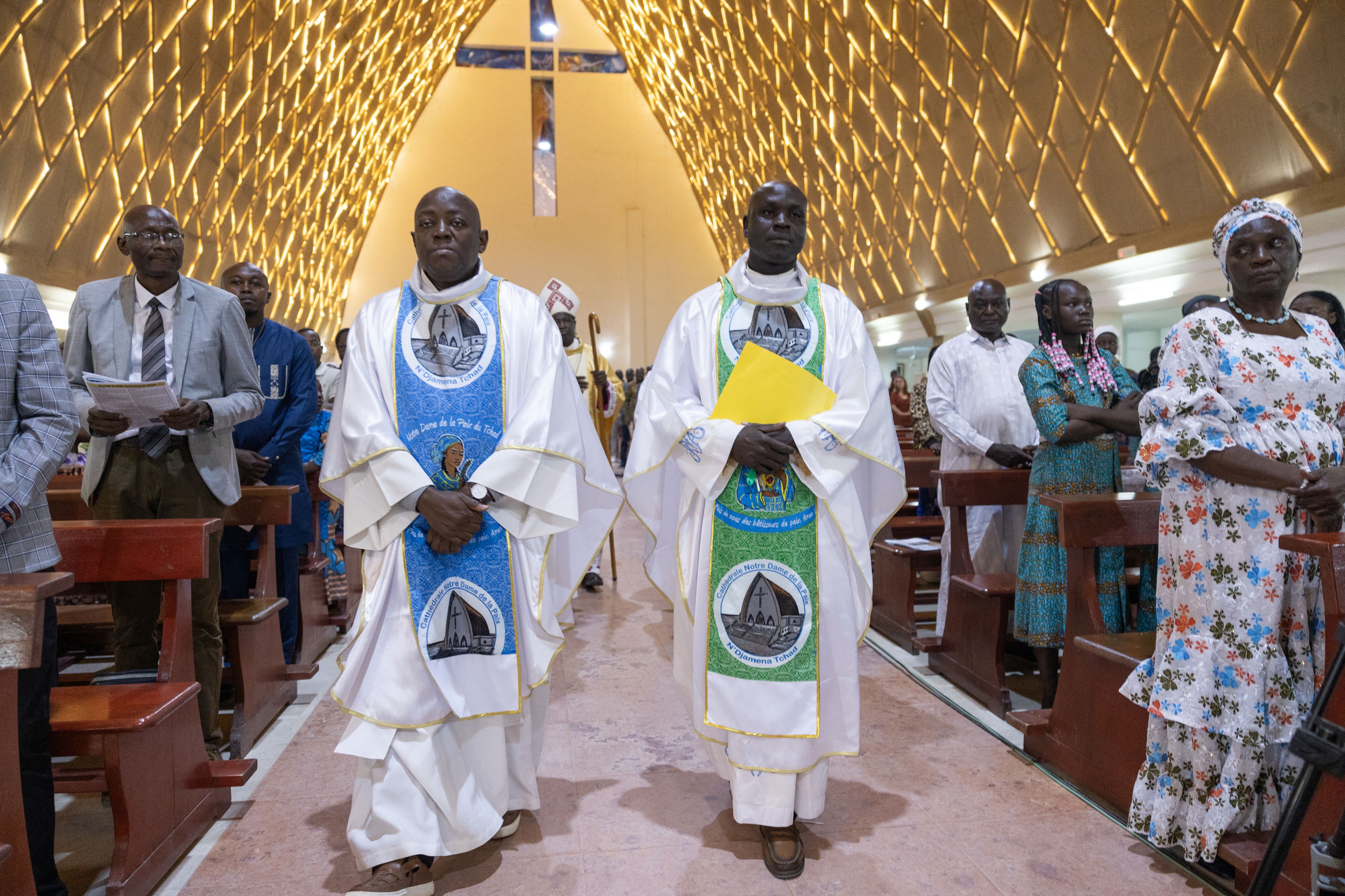 Catholic priests enter the church for the Christmas mass at the Notre Dame de la Paix Cathedral in N'Djamena on December 24, 2024. (Photo by Joris Bolomey/AFP Photo)