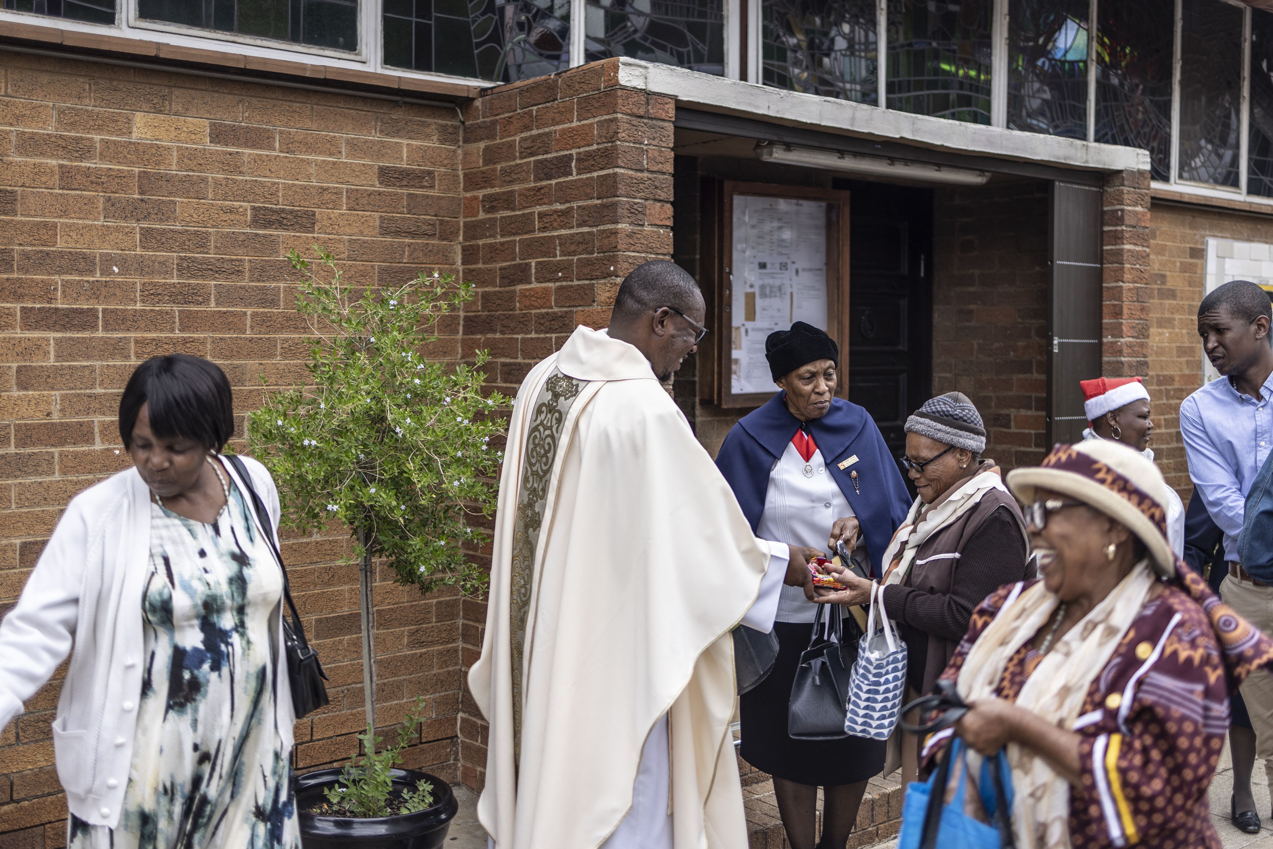 Parish priest of Regina Mundi Church, Fr Nqobile Mzolo OMI (2nd L) gives gifts to parishoners at the end of the Christmas Mass at Regina Mundi Church in Soweto, on December 25, 2024. (Photo by Roberta Ciuccio/AFP Photo)