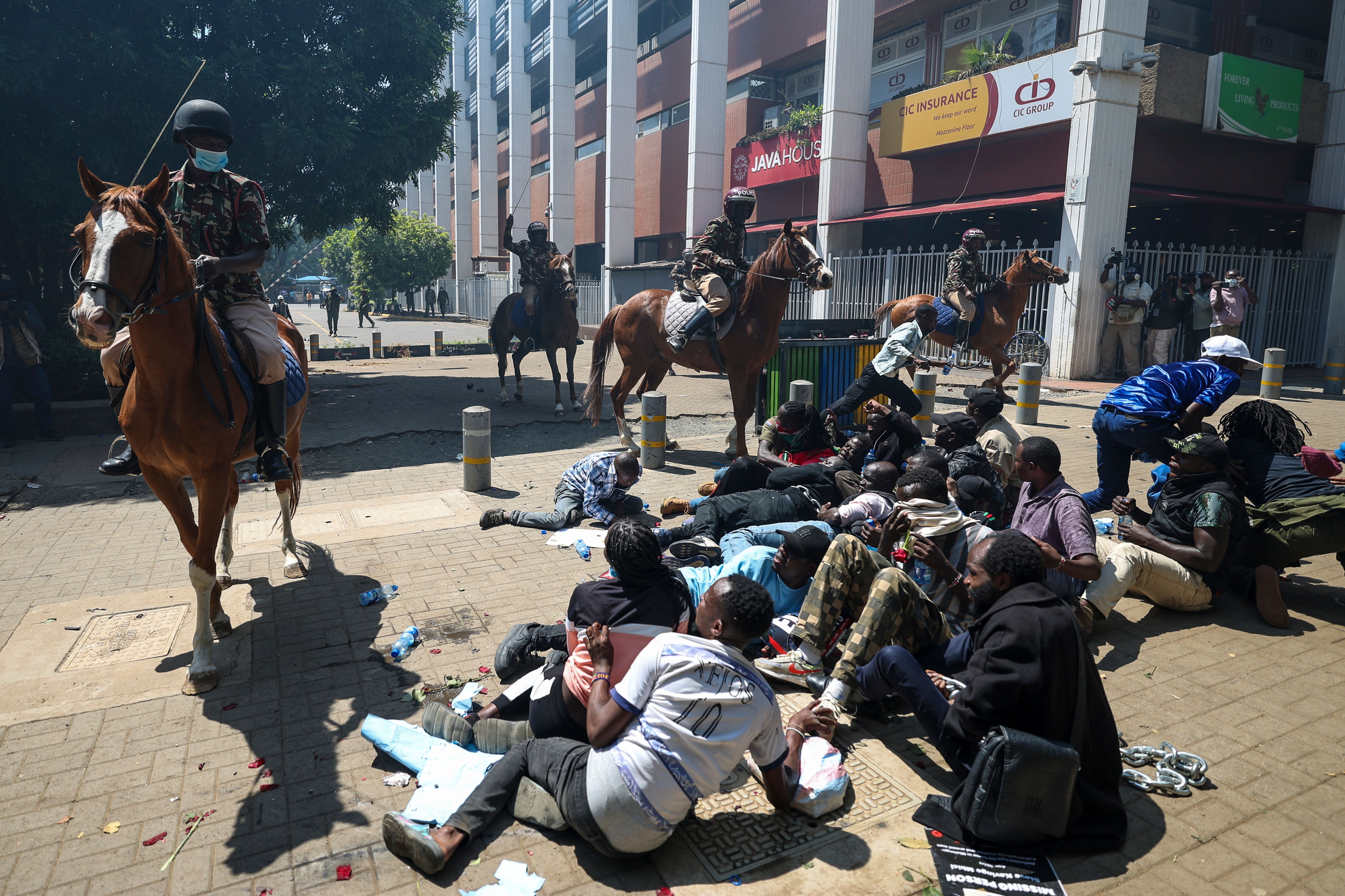 Mounted anti-riot police officers try to disperse activists who had chained themselves on a galvanized steel chain during a protest against the rise in alleged abductions of government critics, in Nairobi, Kenya, 30 December 2024. The protests across the country are in response to a series of suspected abductions linked to state security forces. (Photo by Daniel Irungu/EPA/EFE)