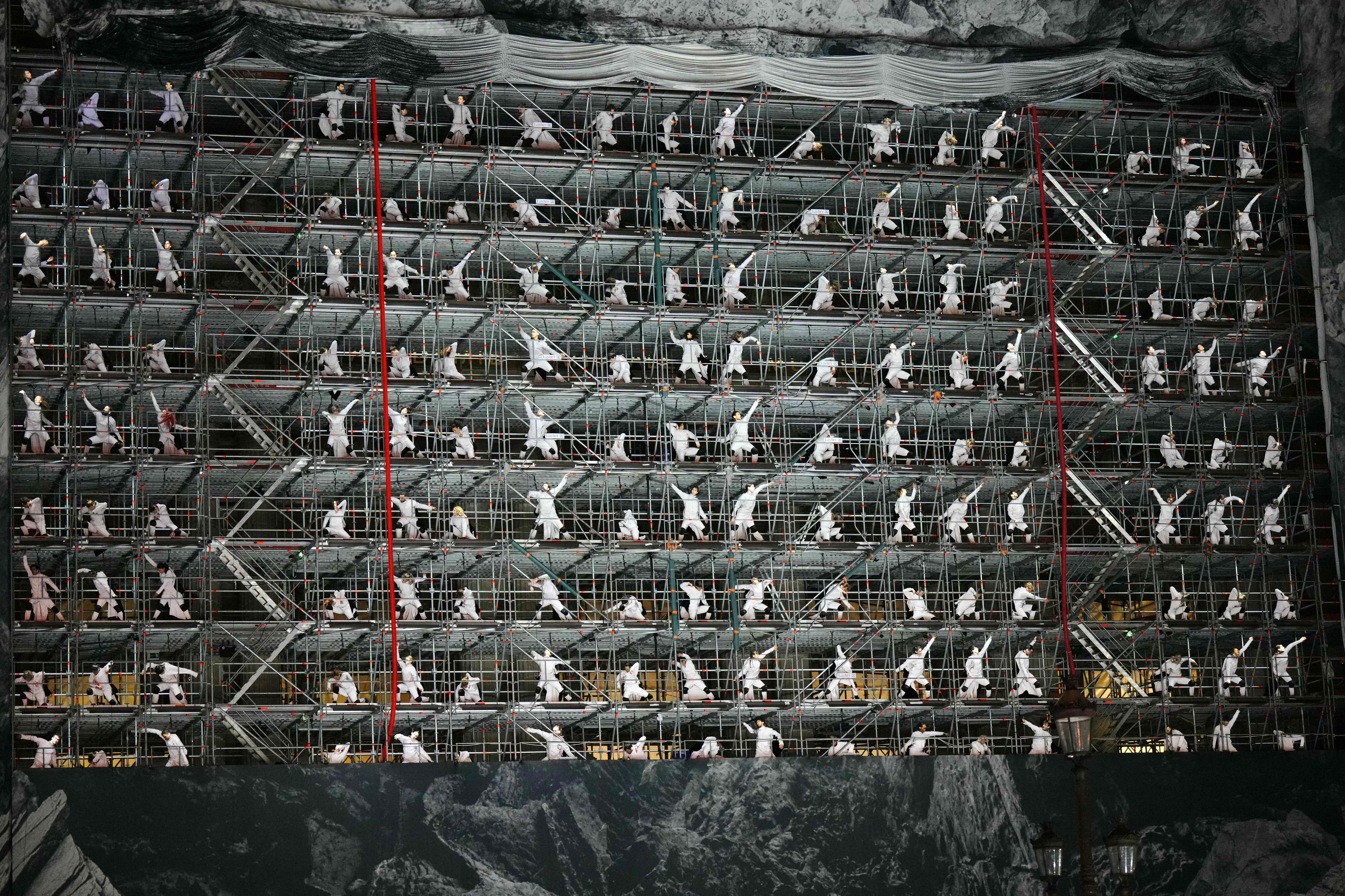 Dancers perform at night during “Chiroptera”, a new project by JR, Thomas Bangalter and Damien Jalet, in front of an installation by French artist JR, depicting the philosophical allegory of Plato's cave, covering part of the facade of the Opera Garnier opera house (Opera National de Paris) during it's renovation, in central Paris on November 12, 2023. In total 153 dancers from all Europe will perform in the event. (Photo by Dimitar Dilkoff/AFP Photo)