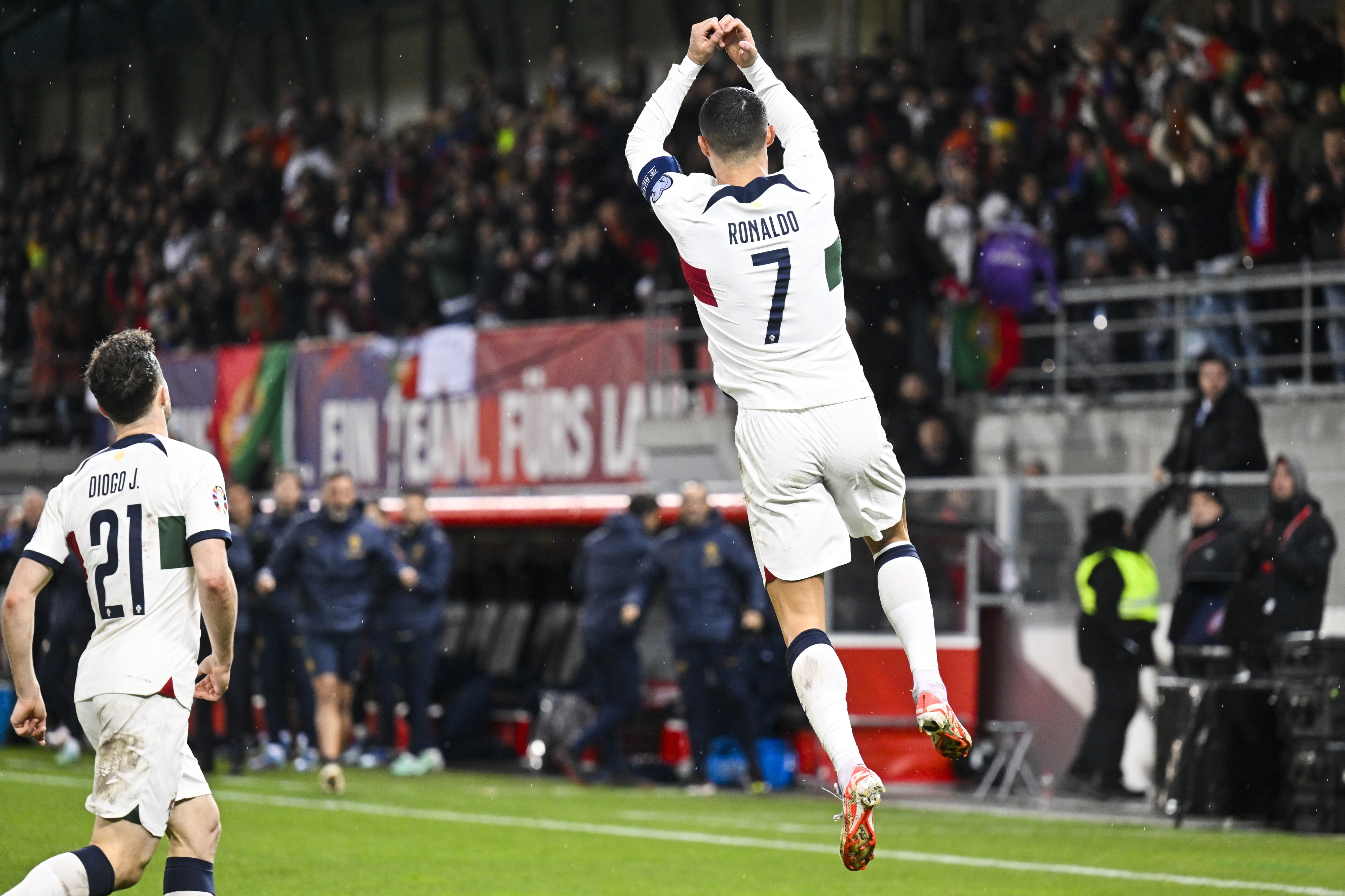 Portugal's Cristiano Ronaldo celebrates after scoring the 0-1 goal during the UEFA Euro 2024 qualification Group J soccer match between Liechtenstein and Portugal, in Vaduz, Liechtenstein, 16 November 2023. (Photo by Gian Ehrenzeller/EPA)