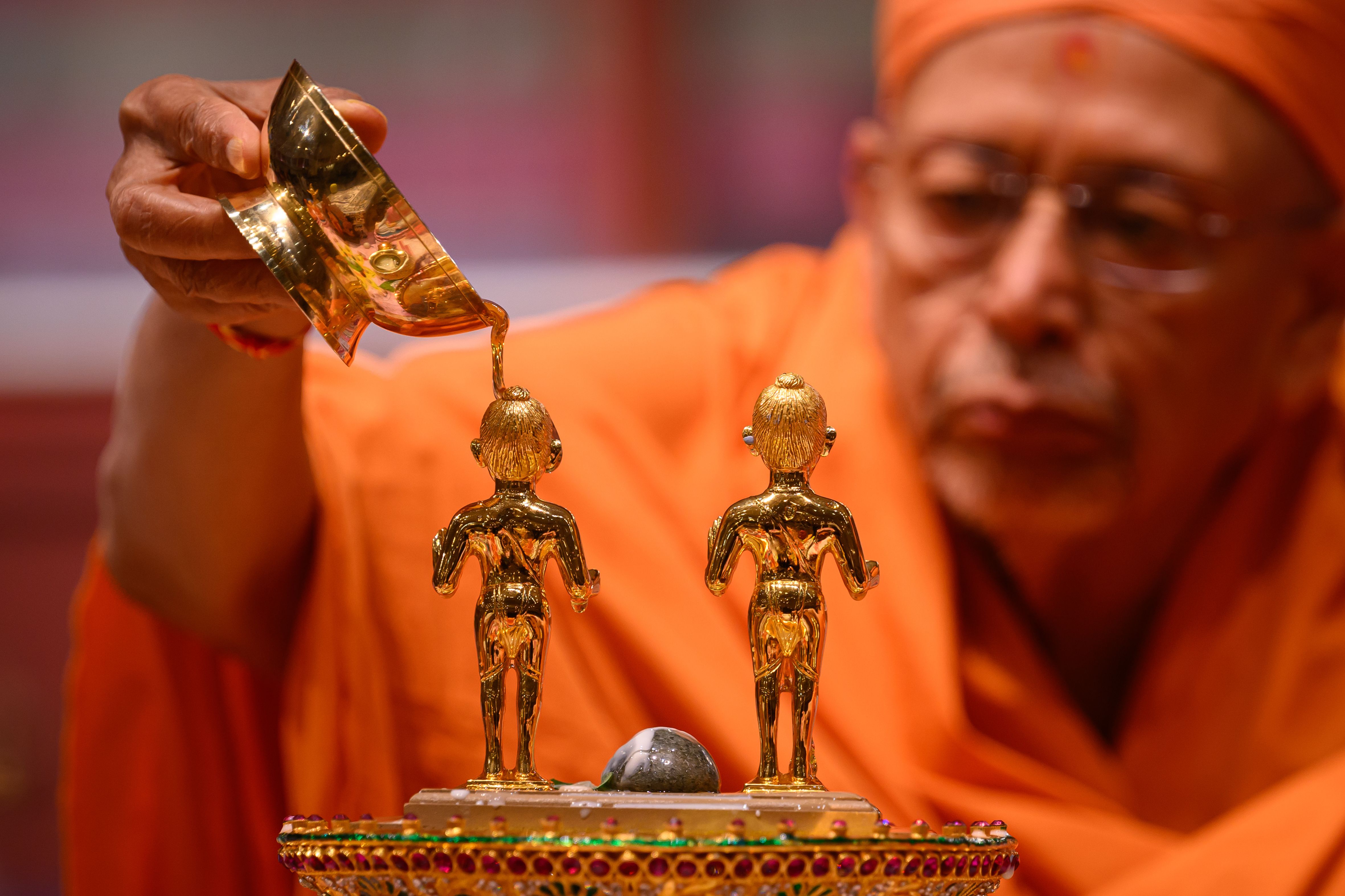 Swami Tyagvallabhdas bathes Shri Akshar-Purushottam Maharaj in the ritual of Sharda Pujan during Diwali celebrations at Neasden Temple, also known as BAPS Shri Swaminarayan Mandir, on November 12, 2023 in the Neasden area of London, England. Diwali (also known as Deepavali) is the Hindu festival of lights celebrated each autumn. (Photo by Leon Neal/Getty Images)