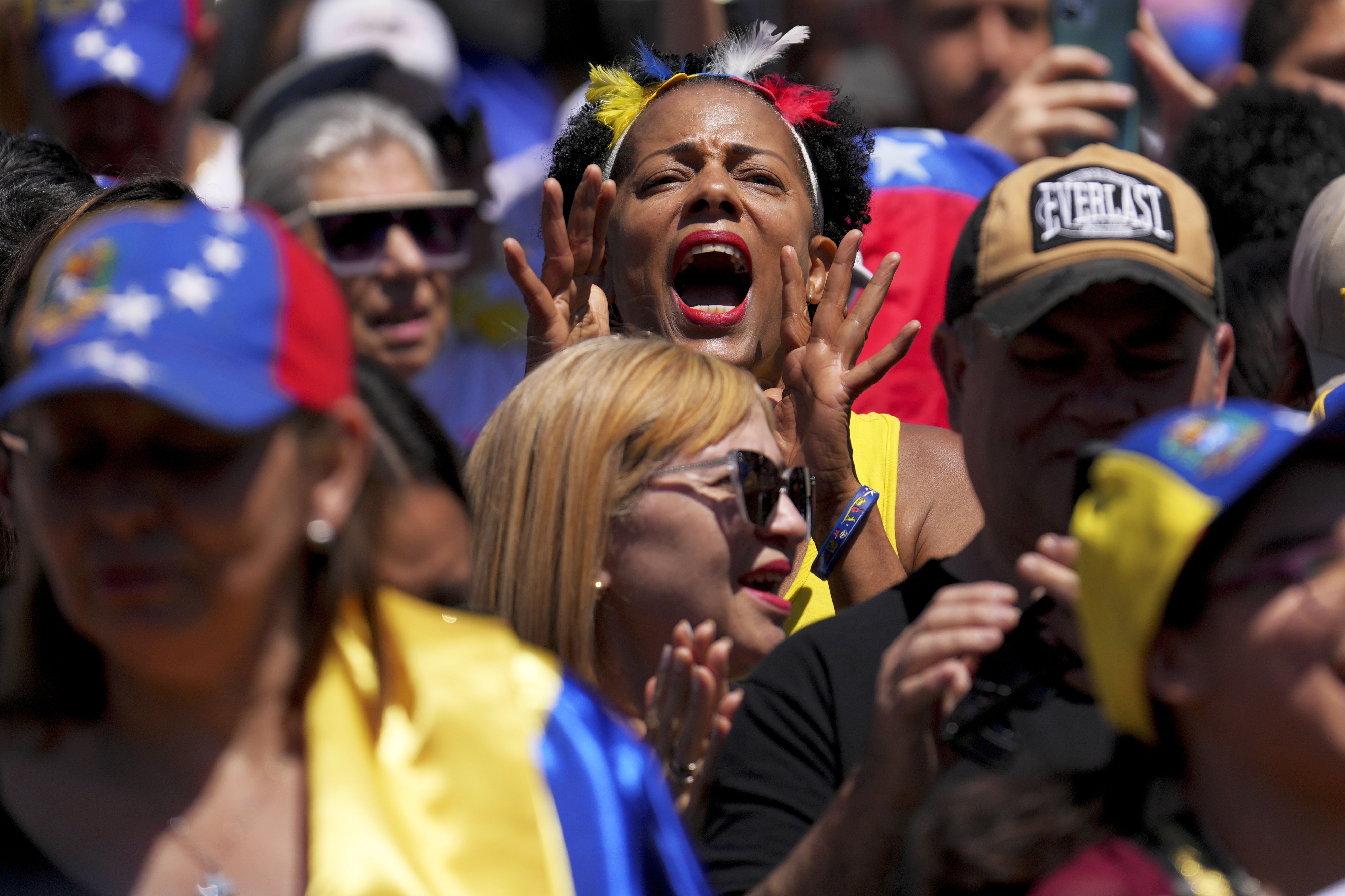 Supporters of Venezuela's opposition leader Edmundo Gonzalez Urrutia gather in Plaza de Mayo outside the government house where he meets with Argentine President Javier Milei in Buenos Aires, Argentina, Saturday, January 4, 2025. (Photo by Natacha Pisarenko/AP Photo)