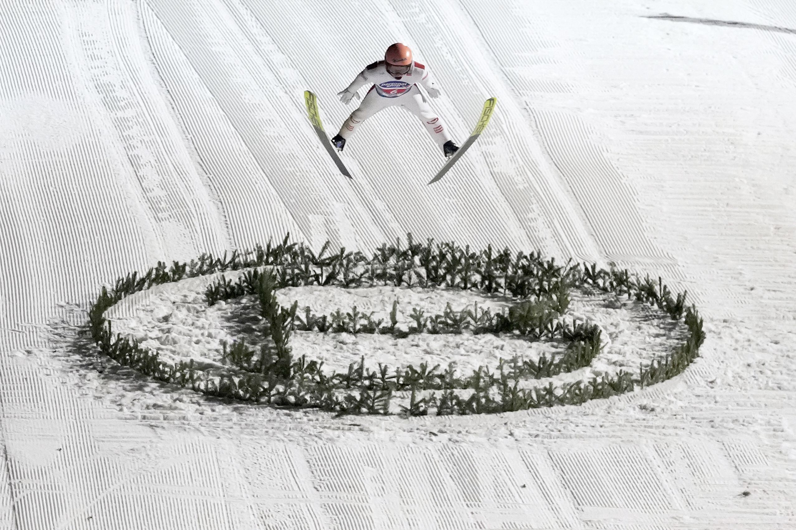 Jan Hoerl, of Austria, soars through the air during his first round jump at the fourth stage of the 73rd Four Hills ski jumping tournament in Bischofshofen, Austria, Monday, January 6, 2025. (Phoot by Matthias Schrader/AP Photo)