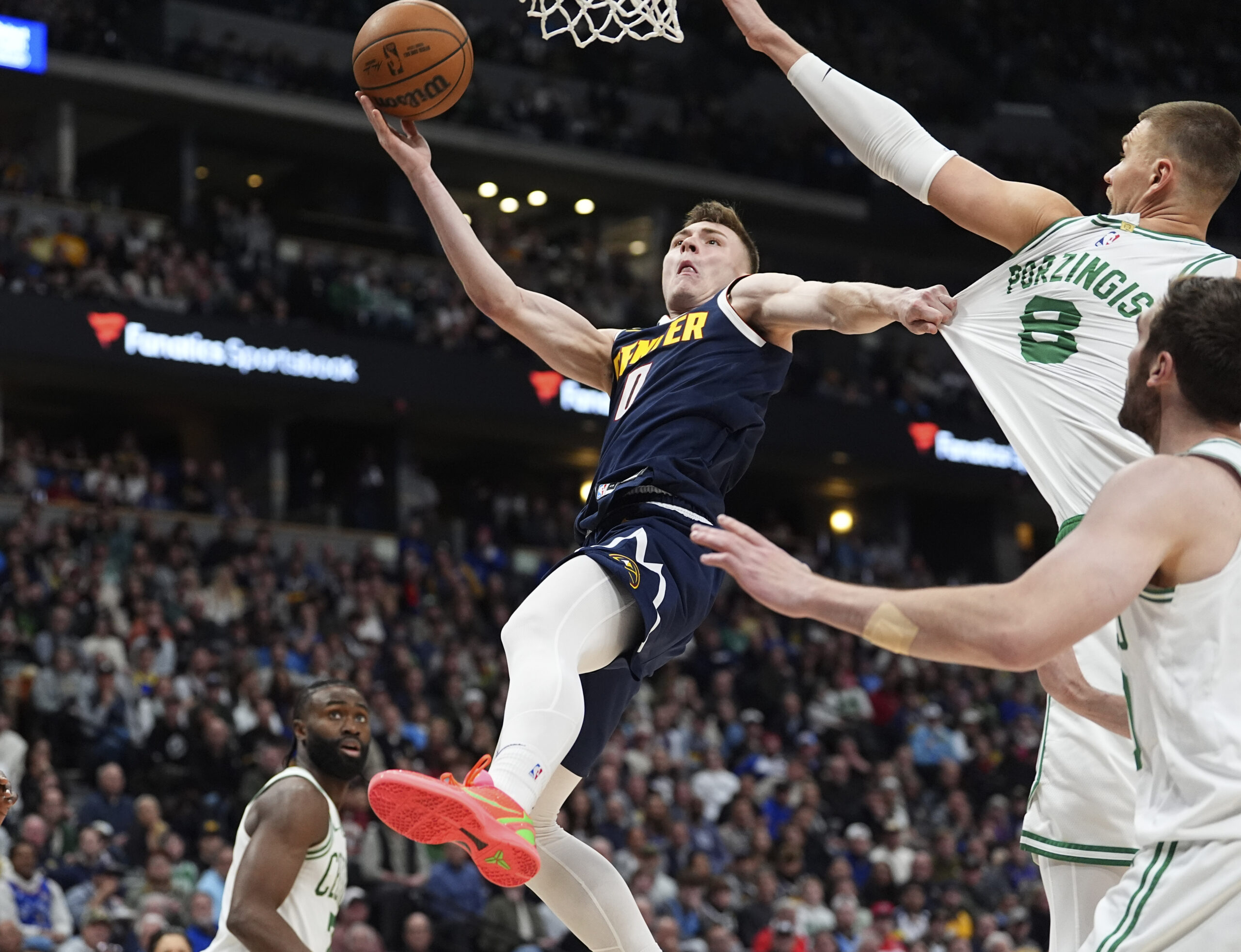 Denver Nuggets guard Christian Braun, left, drives to the basket as Boston Celtics centers Luke Kornet, front right, and Kristaps Porzingis (8) defend in the second half of an NBA basketball game Tuesday, January 7, 2025, in Denver. (Photo by David Zalubowski/AP Photo)