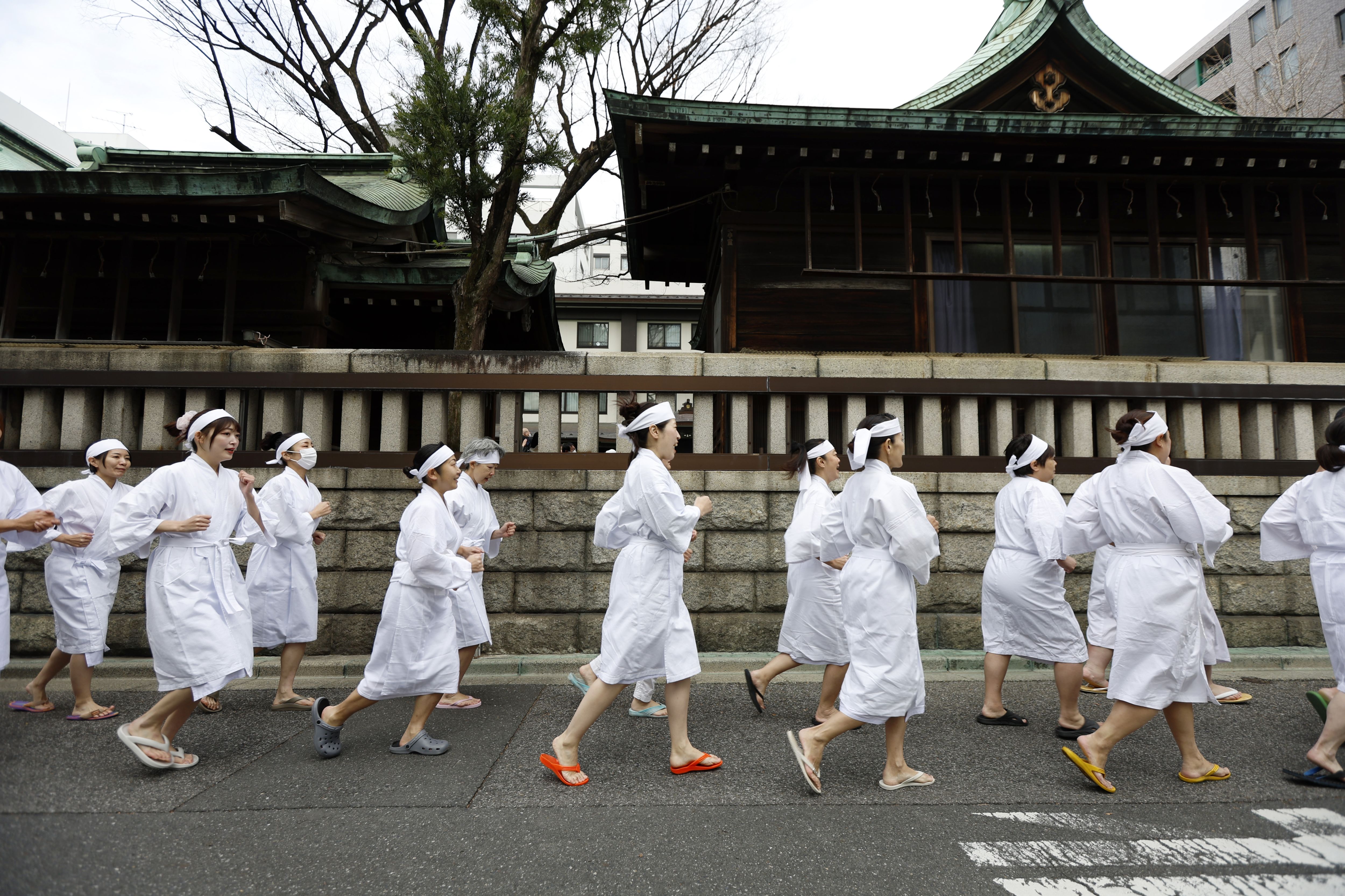 Women run to warm themselves up before bathing in ice-cold water during a ceremony at Teppozu Inari Shrine in Tokyo, Japan, 12 January 2025. 80 men and women took part in the ice water endurance ceremony to purify their souls and pray for good health in the new year. (Photo by Franck Robichon/EPA/EFE)