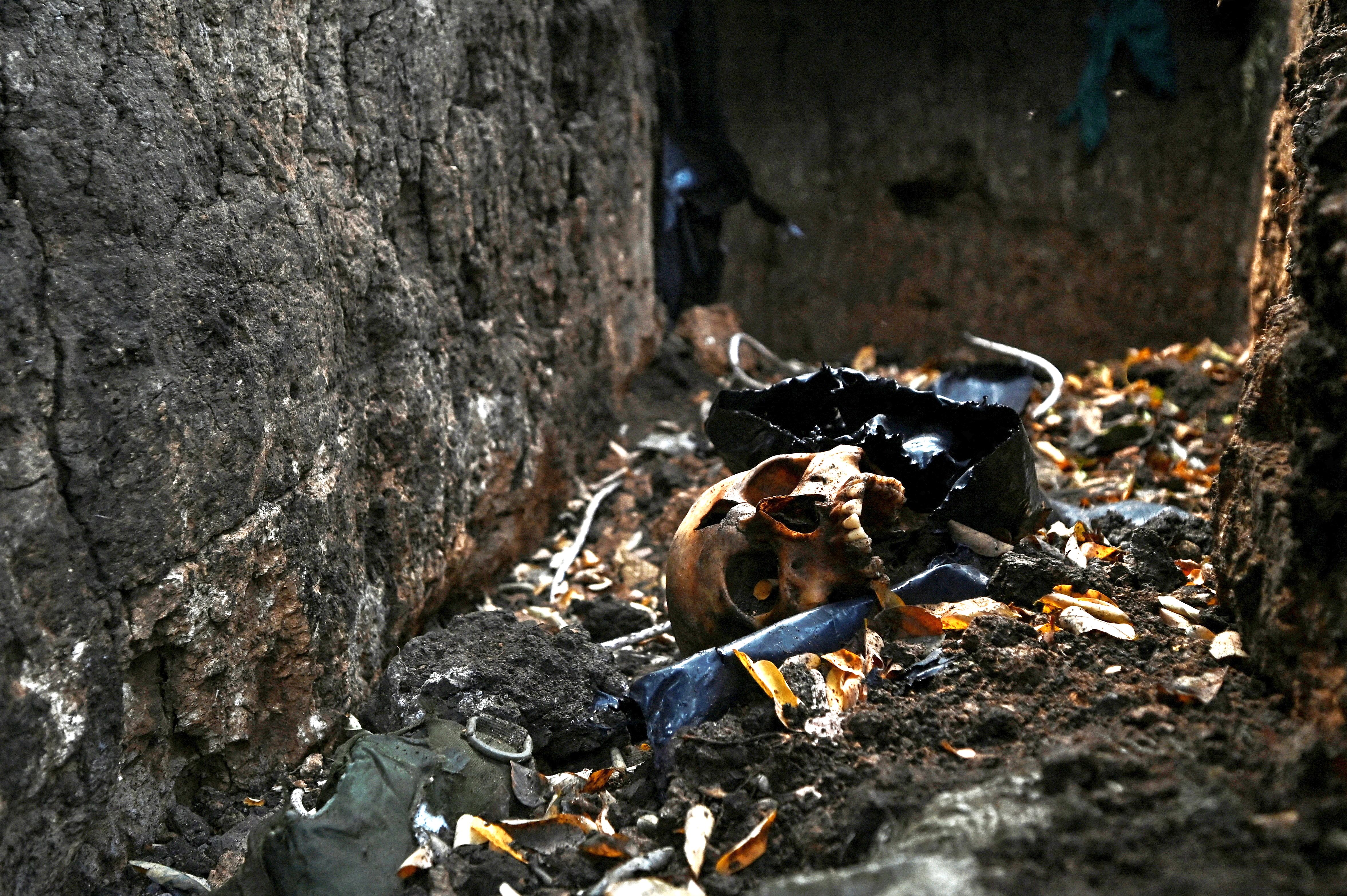 A skull of a Russian soldier is seen inside a trench at a former Russian position outside the village of Robotyne, amid Russia's attack on Ukraine, near a front line in Zaporizhzhia region, Ukraine on November 4, 2023. (Photo by Reuters/Stringer)
