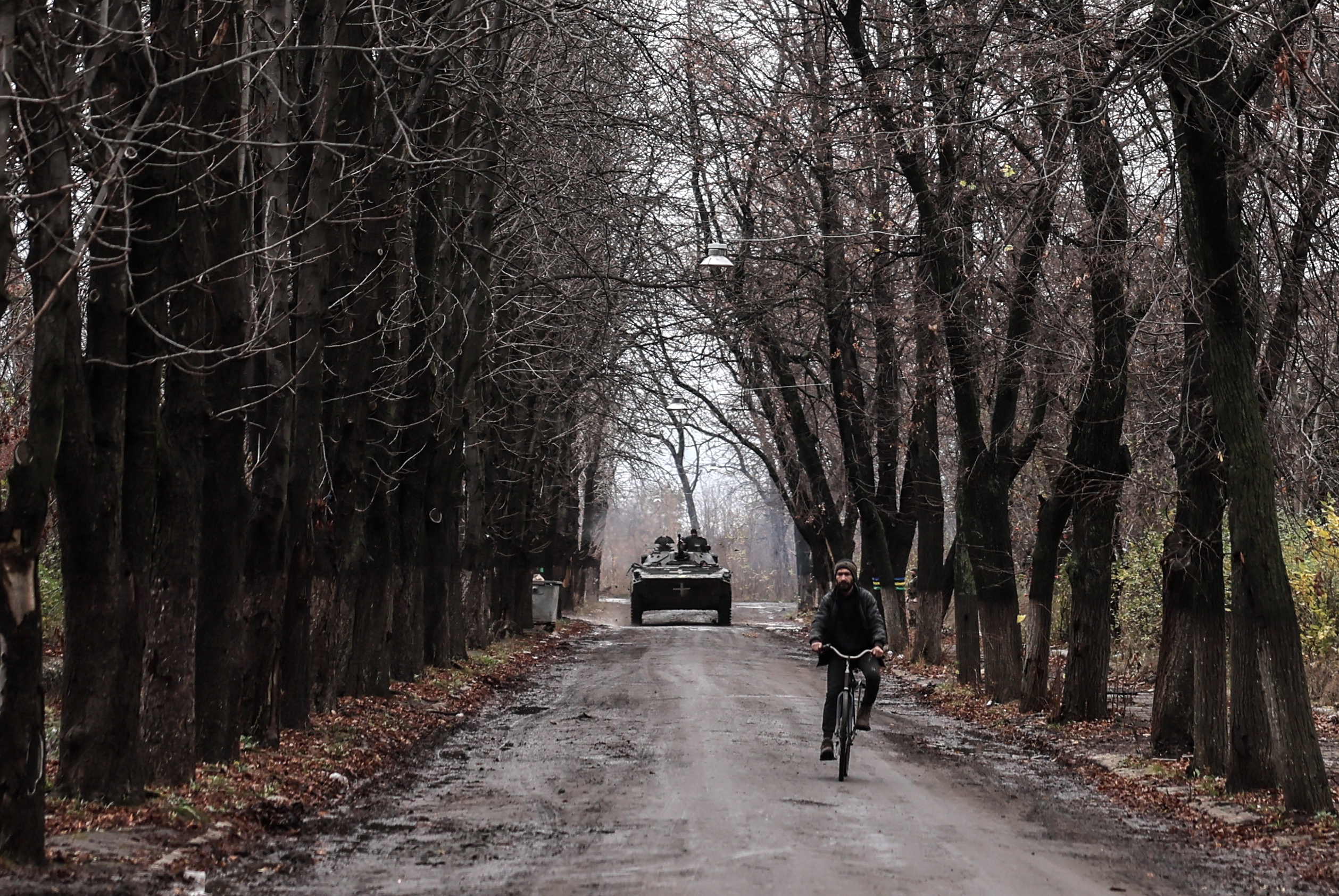 A man cycles as a military infantry vehicle drives through Chasiv Yar, near the frontline in the Donetsk region, Ukraine, 09 November 2023, amid the Russian invasion. Russian troops entered Ukrainian territory in February 2022, starting a conflict that has provoked destruction and a humanitarian crisis. (Photo by Oleg Petrasyuk/EPA/EFE)