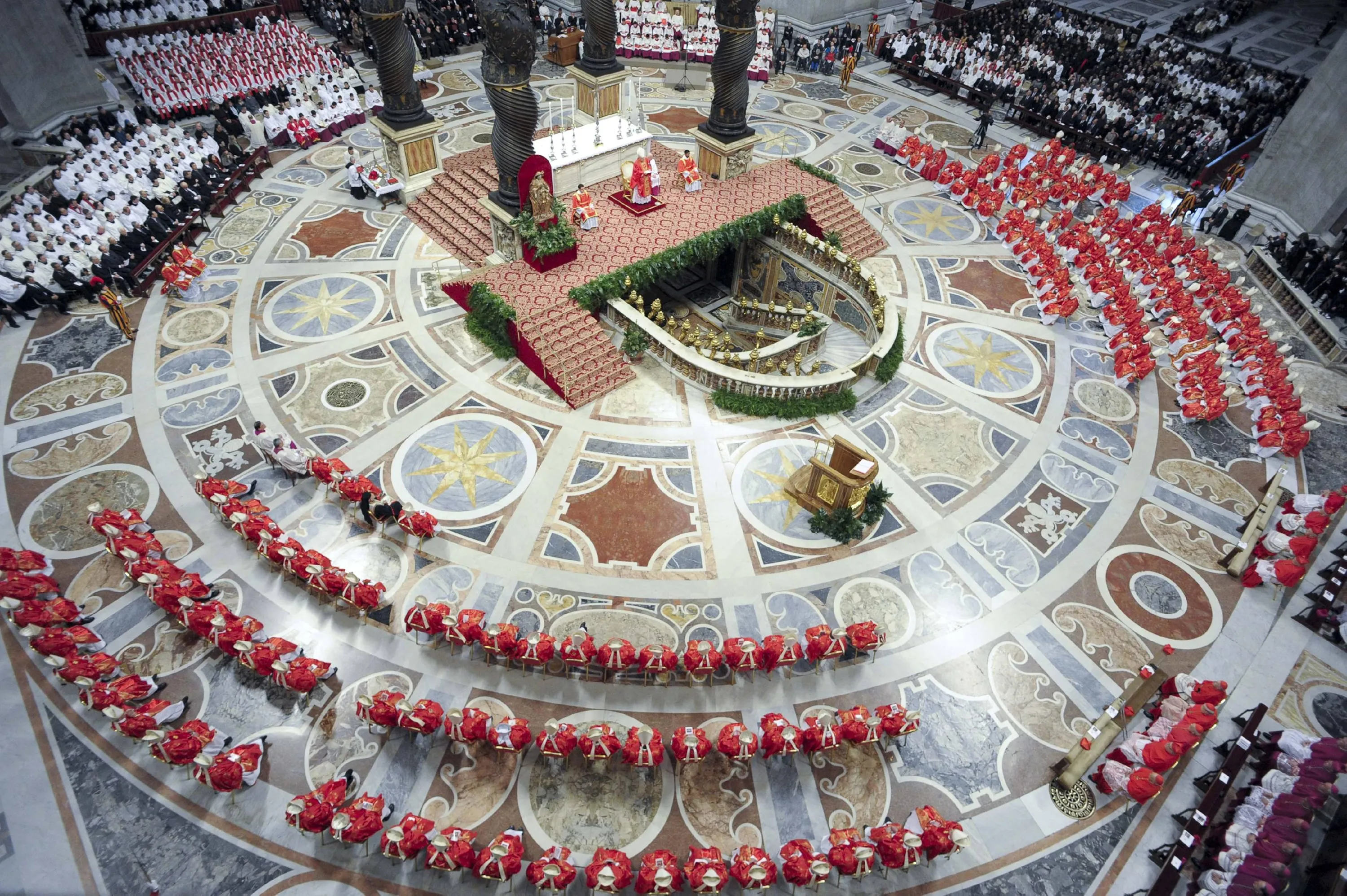 In this photo provided by the Vatican newspaper L'Osservatore Romano, cardinals, in red, attend a Mass for the election of a new pope celebrated by Cardinal Angelo Sodano, figure at the center of the stage beneath the Bernini baldachin, inside St. Peter's Basilica, at the Vatican, Tuesday, March 12, 2013. Cardinals enter the Sistine Chapel on Tuesday to elect the next pope amid more upheaval and uncertainty than the Catholic Church has seen in decades: There's no front-runner, no indication how long voting will last and no sense that a single man has what it takes to fix the many problems. (Photo by L'Osservatore Romano, ho/AP Photo)