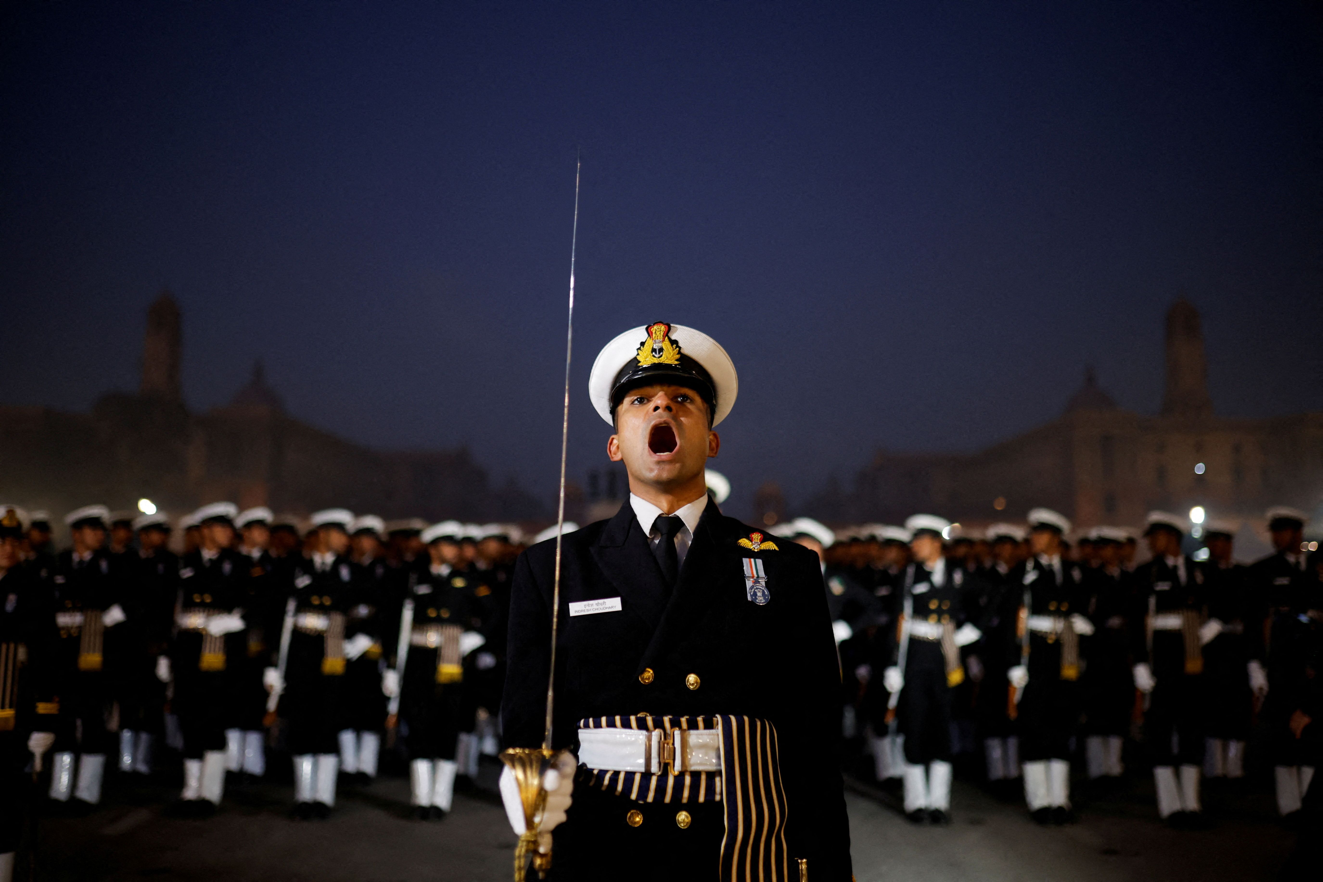 Indian soldiers march during a rehearsal for the upcoming Republic Day parade in New Delhi, India, on January 9, 2025. (Photo by Anushree Fadnavis/Reuters)