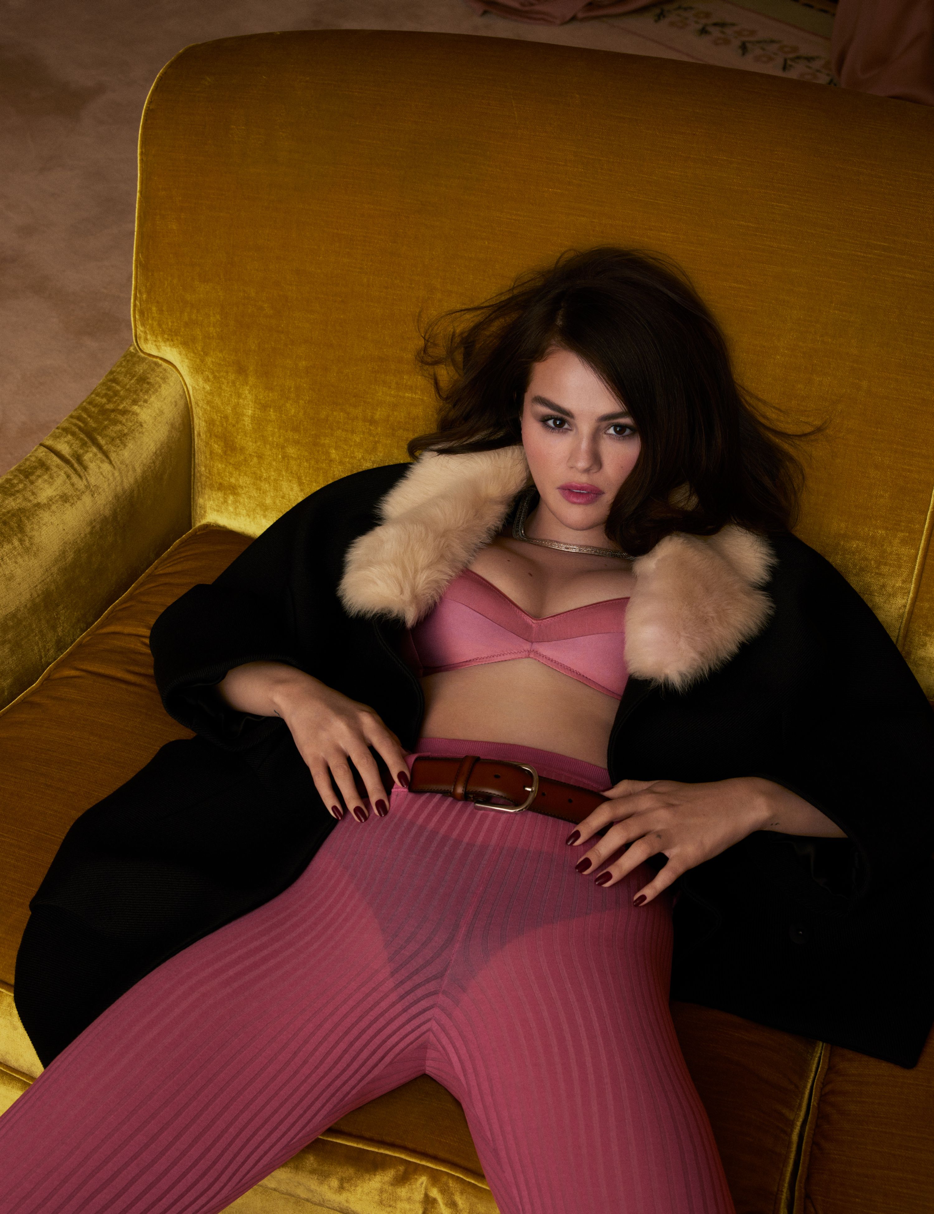 American actress and singer Selena Gomez also posed in a pink bra and tights for W Magazine's first issue of 2025. (Photo by Mert Alas and Marcus Piggott)