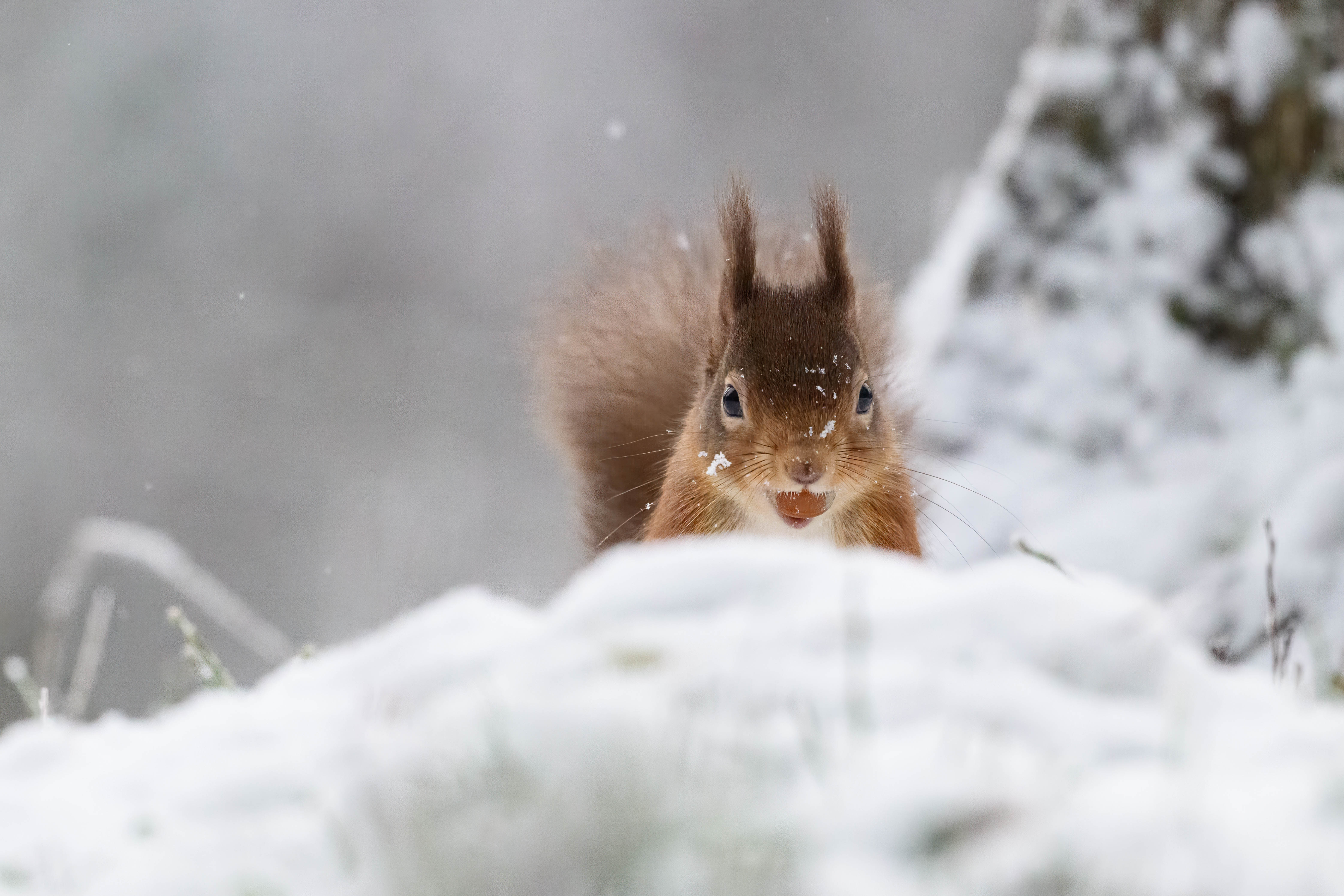 A red squirrel peeps out from behind a snow bank in Inverness-shire, Scotland on January 6, 2025. (Photo by Jane Hobson/Rex Features/Shutterstock)