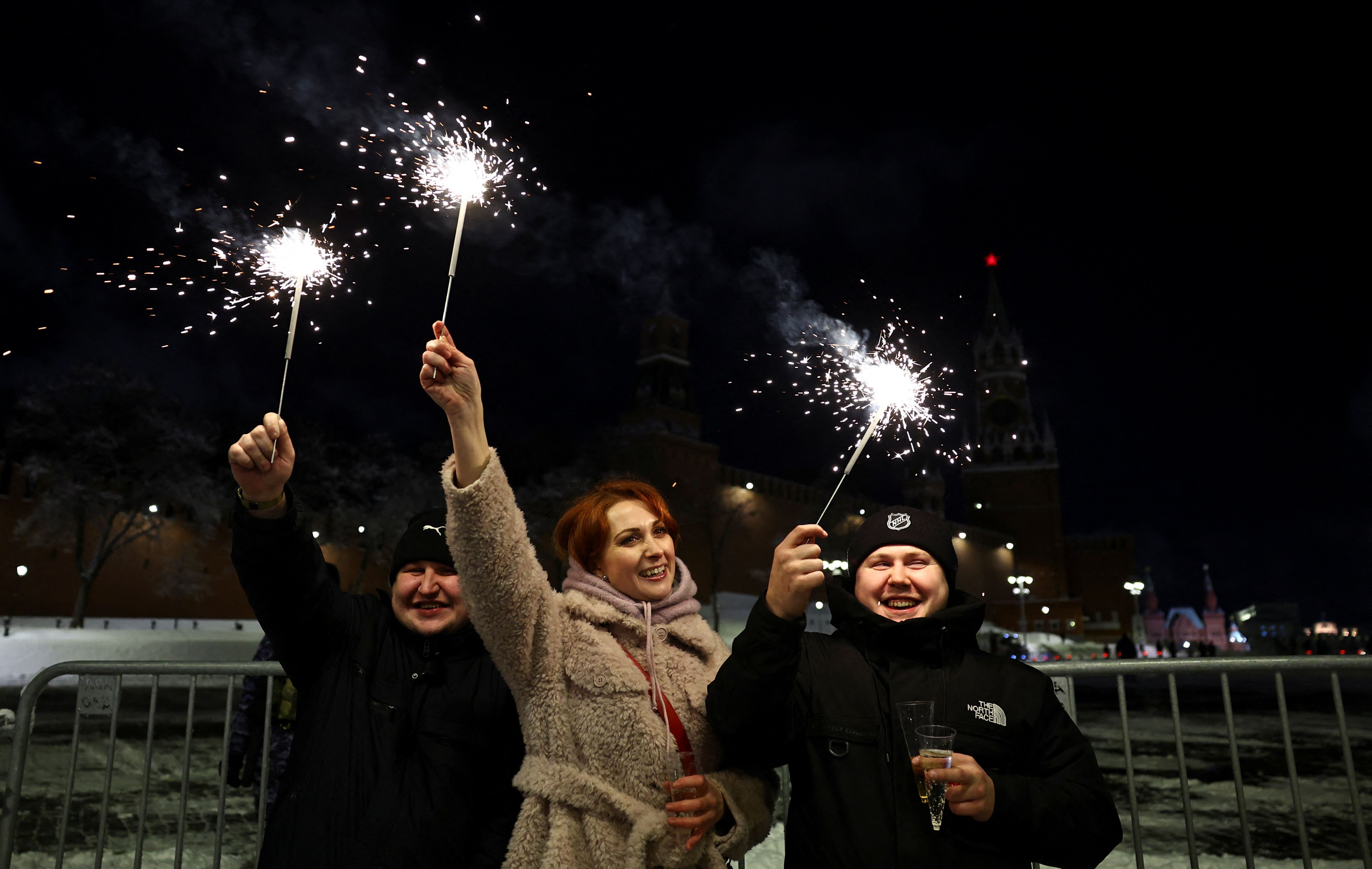 People light sparklers during New Year celebrations near Red Square in central Moscow, Russia, on January 1, 2025. (Photo by Evgenia Novozhenina/Reuters)