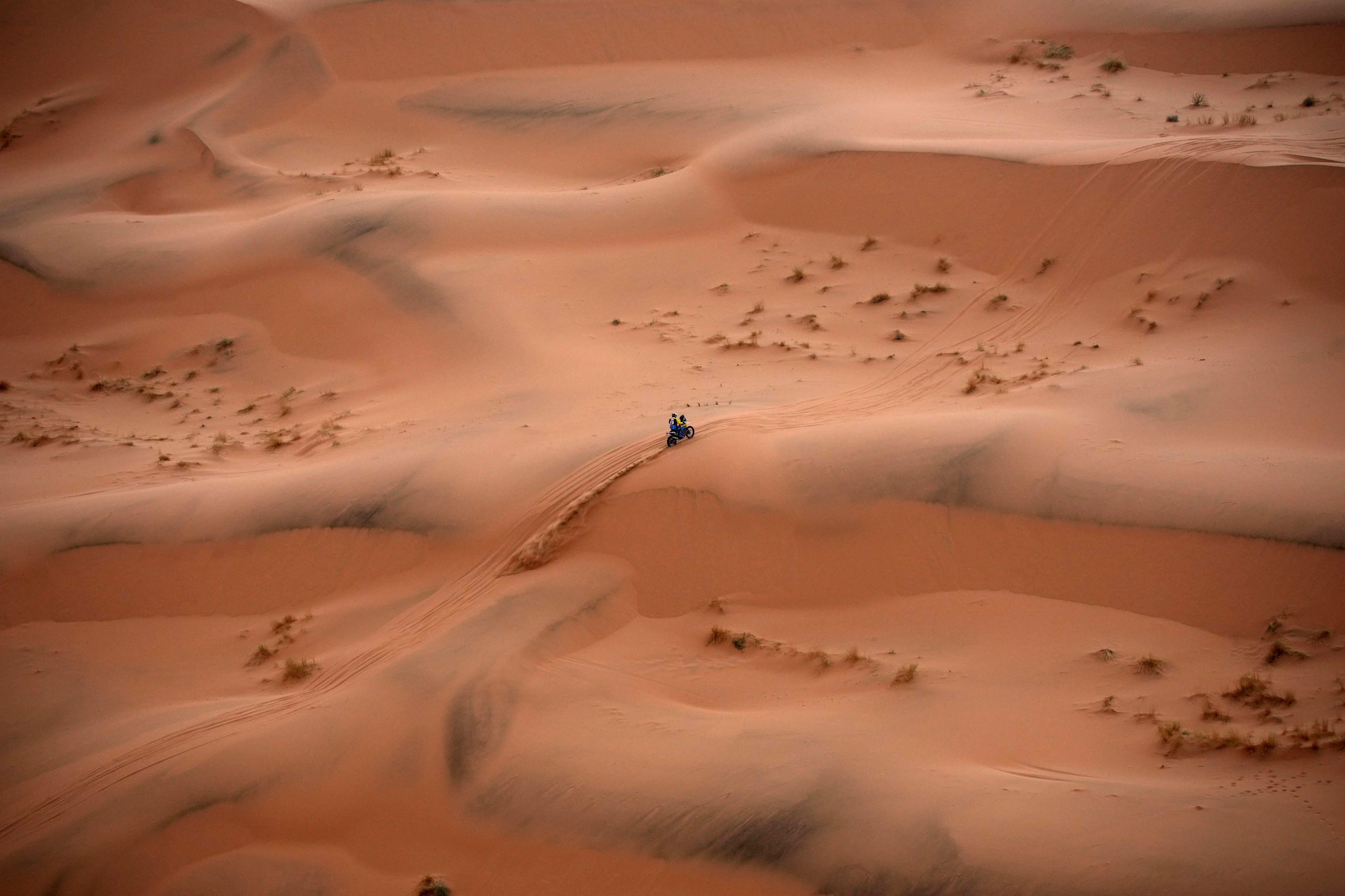 Milan Engel rides on the sand dunes during the seventh stage of the Dakar Rally with start and finish in Al Duwadimi, Saudi Arabia, Sunday, January 12, 2025. (Photo by Christophe Ena/AP Photo)