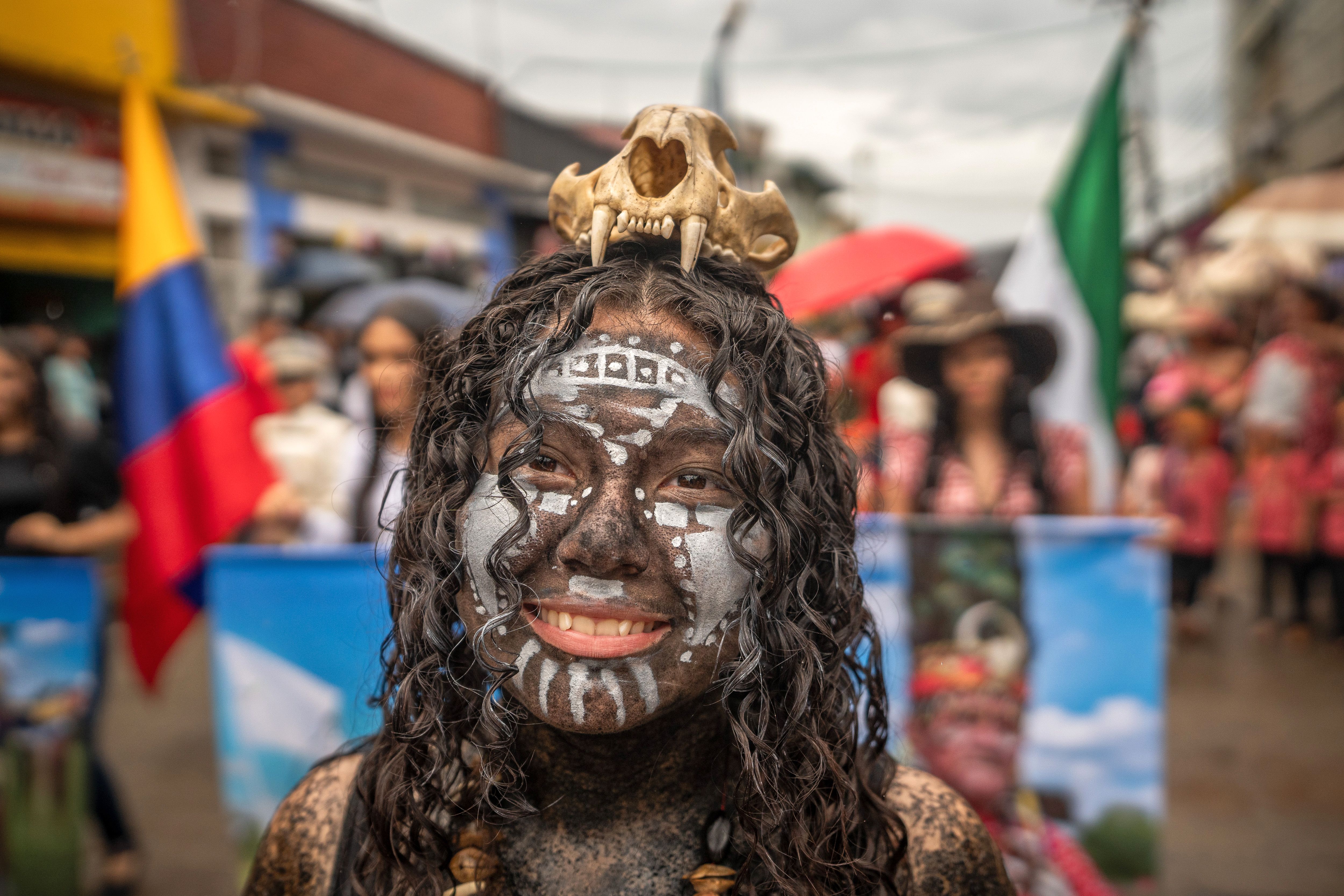 A child dressed as “Cachacero” poses during “San Martinidad parade” as part of the 56th Folkloric and Tourist International Festival of the “llano” on November 10, 2023 in San Martin, Colombia. The “Cuadrillas de San Martin” is an almost 300-years old tradition where the horsemen in San Martin show their skills in a contest with a series of 10 different games. It is not clear if the tradition comes from Spanish riders or from the Achagua indigenous, but the reason of the games was for fighting the territory between the Galanes, Moros, Guahibos and Cachaceros cultures, representing (in the same order) the Spanish, Arabs, indigenous and Africans. Today, is one of the most recognized cultural expression around and abroad Colombia. (Photo by Diego Cuevas/Getty Images)