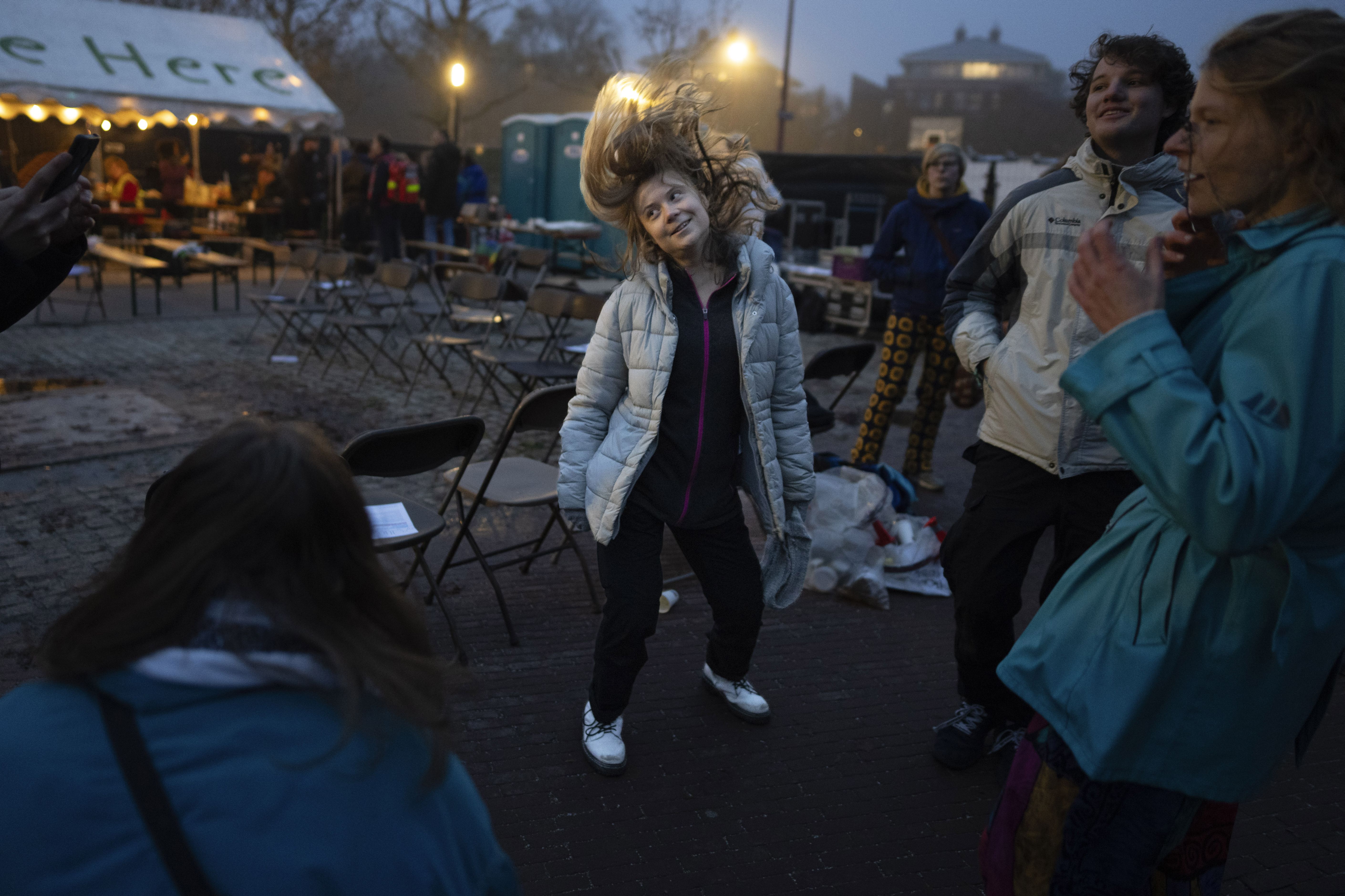 Climate activist Greta Thunberg dances after addressing tens of thousands of people who marched through Amsterdam, Netherlands, Sunday, November 12, 2023, to call for more action to tackle climate change. Thunberg was among the speakers at the march that comes 10 days before national elections in the Netherlands. (Photo by Peter Dejong/AP Photo)