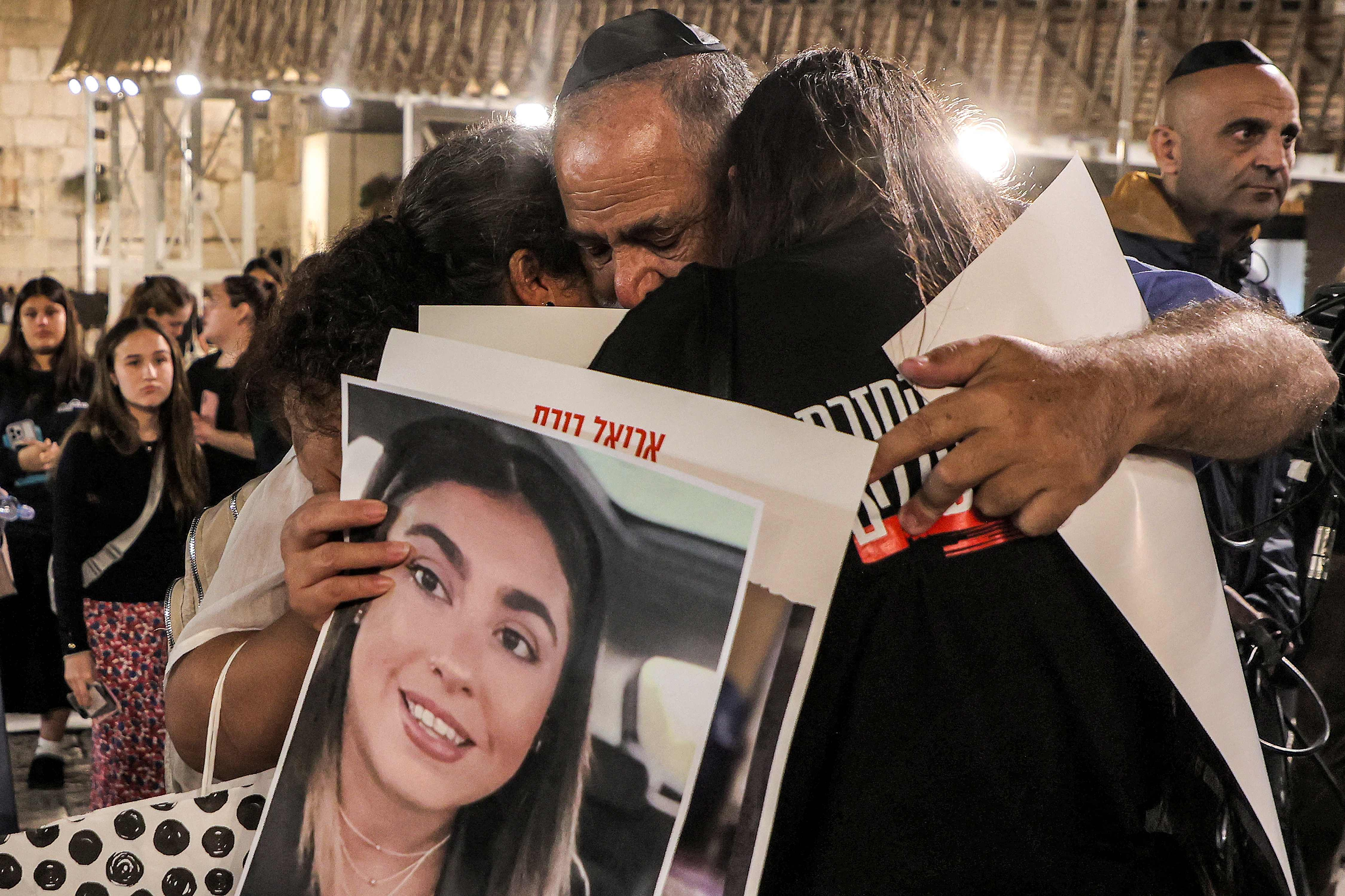 A man embraces two women as he holds posters identifying one of the hostages abducted by Palestinian militants during October 7 attack and currently held in the Gaza Strip, during a vigil for the hostages and victims of the attack near the Western Wall, the holiest site where Jews are allowed to pray, in the old city of Jerusalem on November 7, 2023. (Photo by Gil Cohen-Magen/AFP Photo)