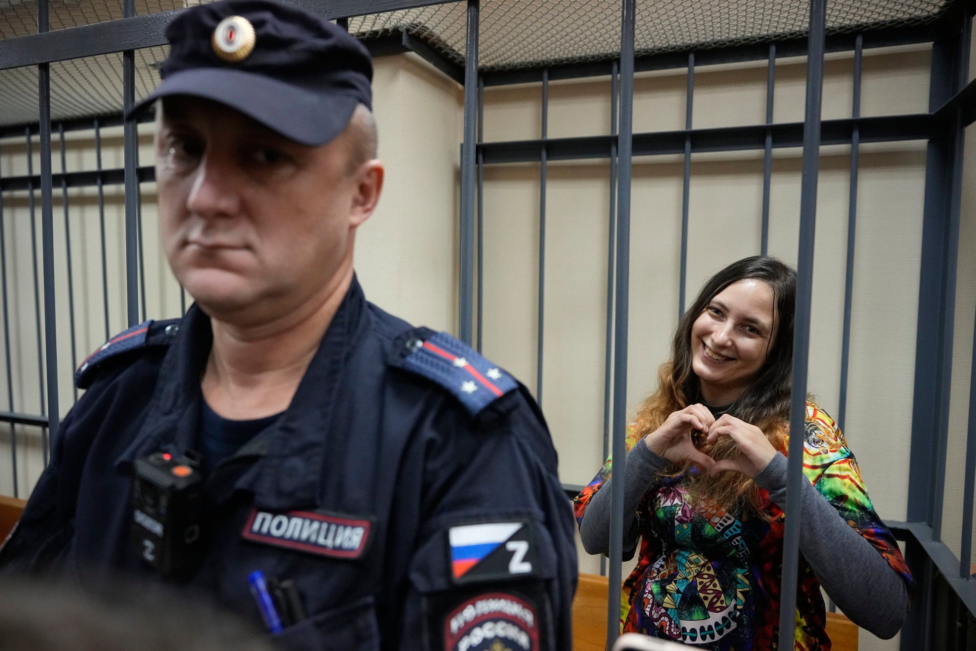 Sasha Skochilenko, a 33 year-old artist and musician shows a heart behind bars in the court room as she waits for a hearing in the Vasileostrovsky district court in St. Petersburg, Russia, Tuesday, November 14, 2023. A court in St Petersburg has to deliver a verdict to a young artist Sasha Skochilenko on charges of spreading “fakes” about the Russian military after she replaced four small price tags in a St. Petersburg supermarket with anti-war slogans. The prosecution asked to sentence her to 8 years in prison. (Photo by Dmitri Lovetsky/AP Photo)