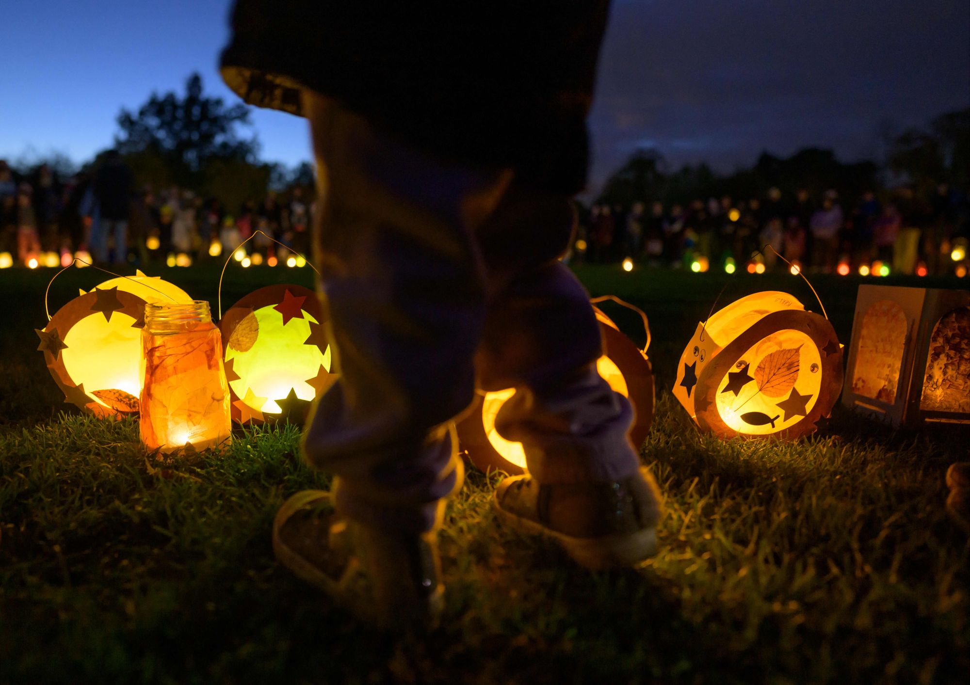 A kindergarten child attends a lantern festival to celebrate upcoming Saint Martin’s day at the Auer-Welsbach park in Vienna, Austria on November 8, 2023. Children in many parts of Europe, particularly German-speaking regions, traditionally celebrate the St Martin's Day on November 11 with a lantern procession with self-made paper lampions and sometimes also a bonfire and a St Martin's horse to commemorate St Martin of Tours (Martin le Misericordieux), who is known for cutting with his sword his cloak in half to share with a beggar in the depth of winter. (Photo by Joe Klamar/AFP Photo)