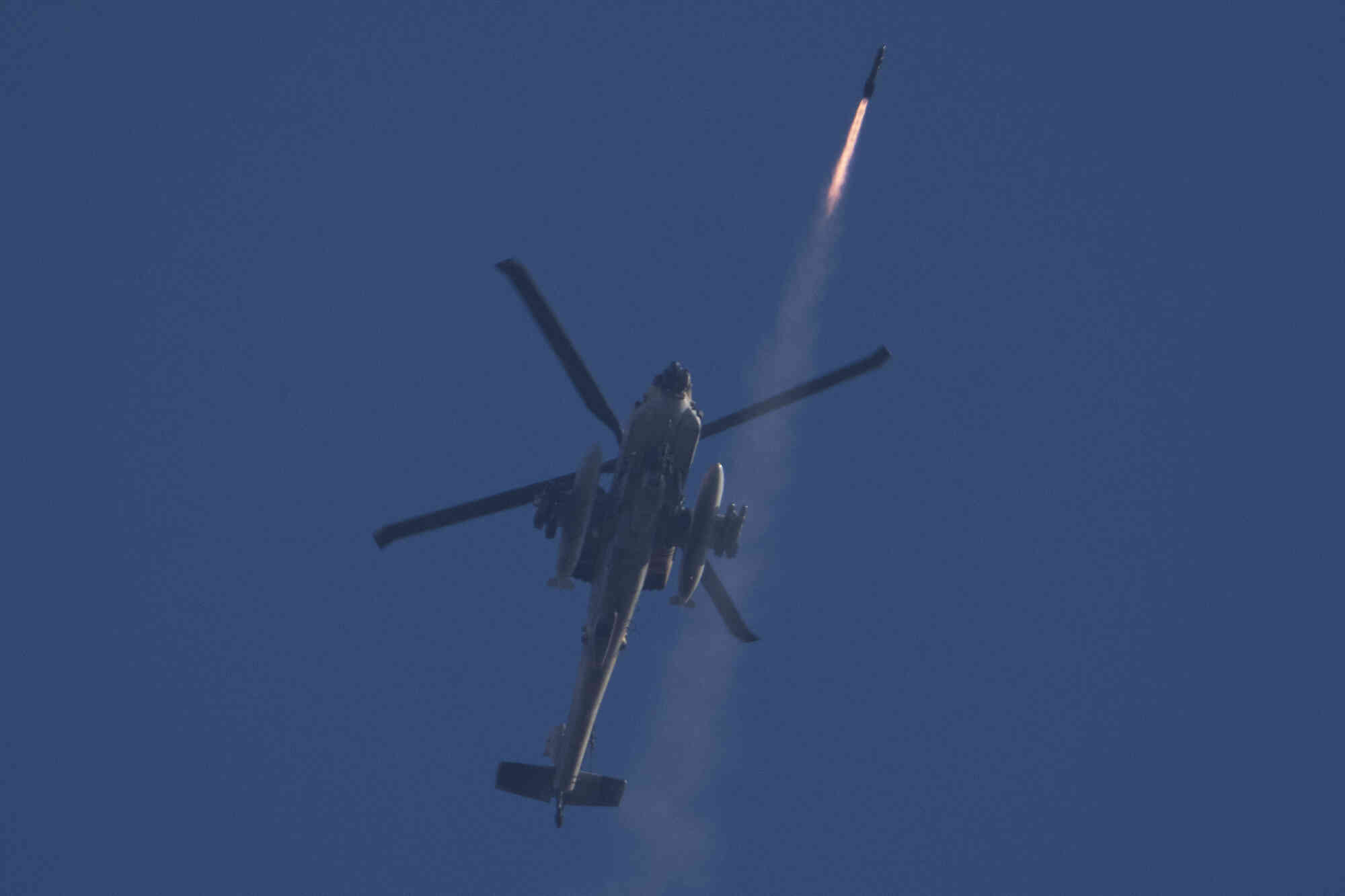 An Israeli Apache helicopter fires a missile towards southern Lebanon as seen from northern Israel, Friday, October 4, 2024. (Photo by Leo Correa/AP Photo)