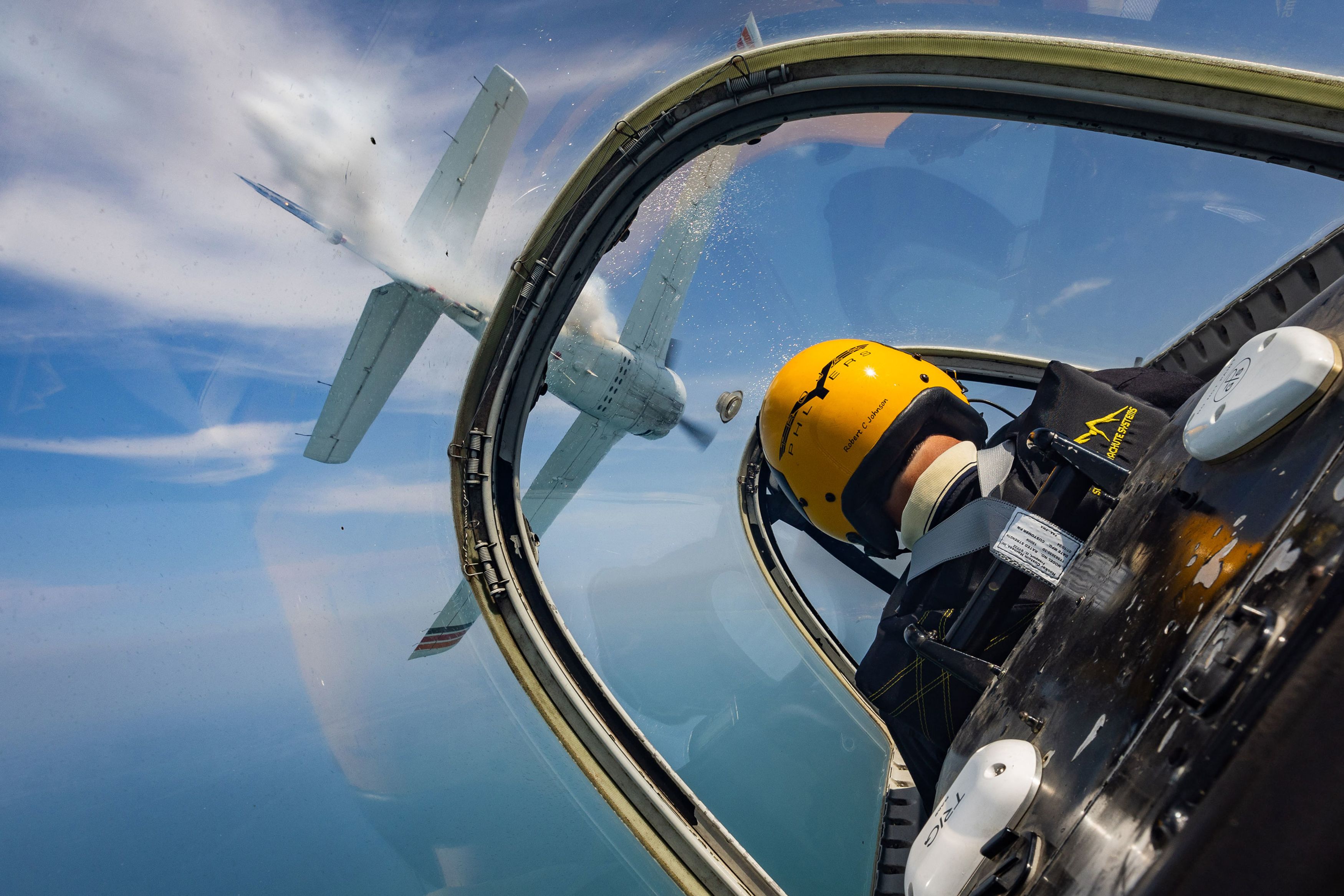 Pilot Robert Johnson, with the Trojan Phlyers Flight Demonstration Team, flies a North American T-28 Trojan above Gary, Indiana, on Thursday, August 8, 2024 ahead of the Chicago Air and Water Show. (Photo by Tess Crowley/Chicago Tribune/Tribune News Service via Getty Images)