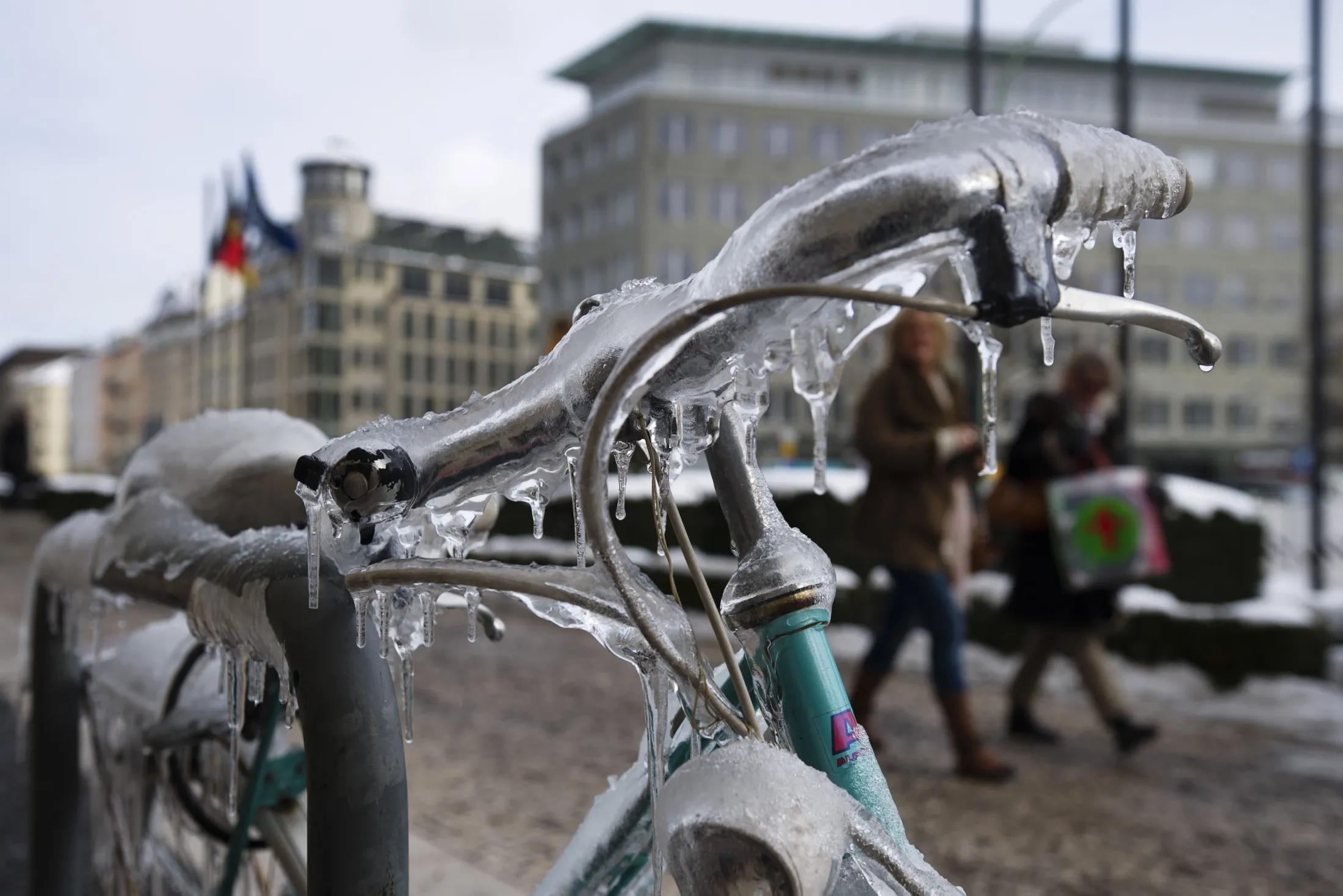 Icycles hang from a bike standing in Berlin on March 12, 2013. Winter came back to wide parts of the country, bringing snow and cold temperatures. (Photo by Emily Wabitsch/AFP Photo)