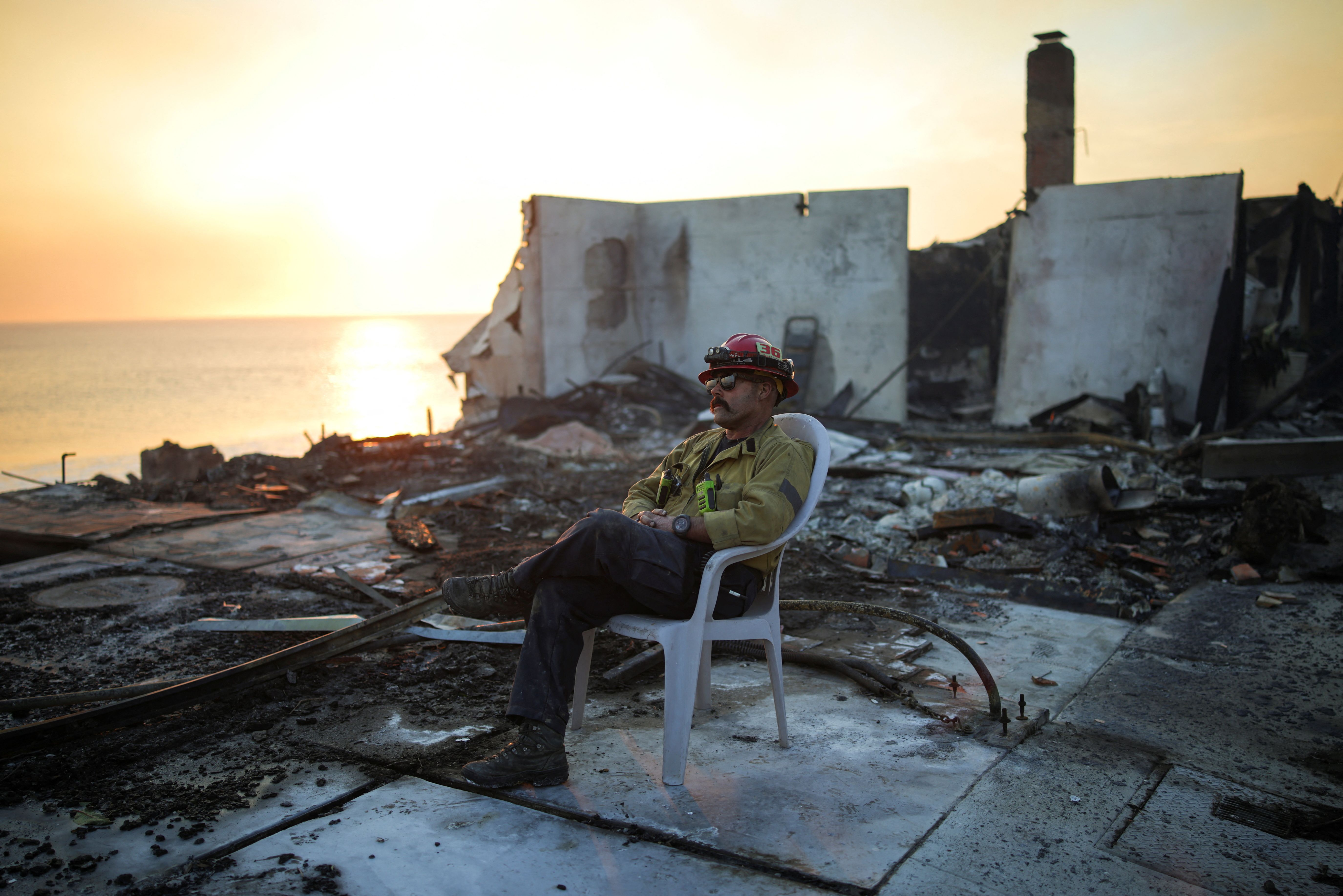A firefighter sits on a chair amid the remains of a burnt structure along the Pacific Coast Highway in Malibu, on January 8, 2025. (Photo by Daniel Cole/Reuters)