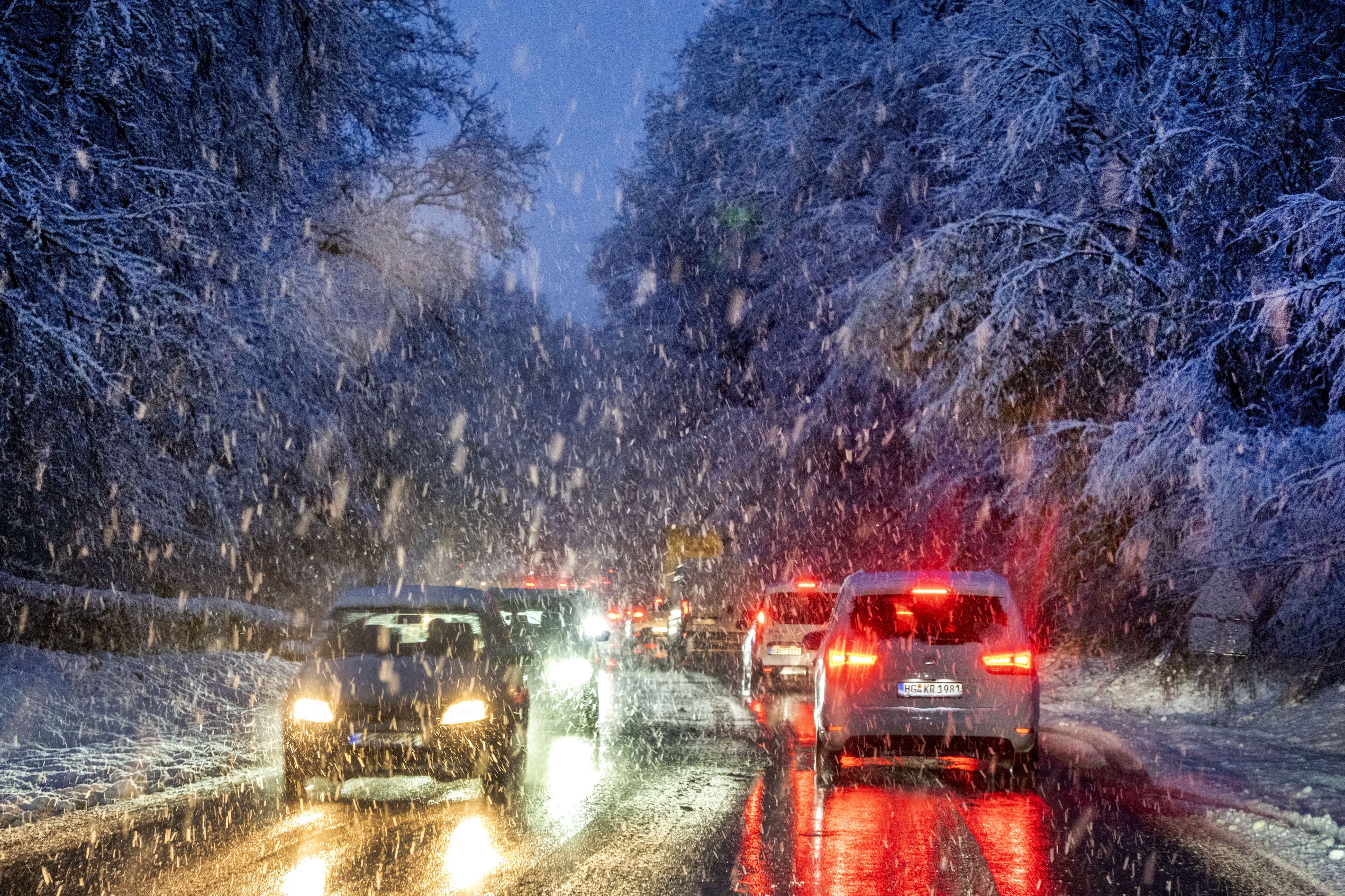 Commuters queue in heavy snowfalls on a country road in a forest of the Taunus region near Frankfurt, Germany, early Tuesday, November 28, 2023. (Photo by Michael Probst/AP Photo)