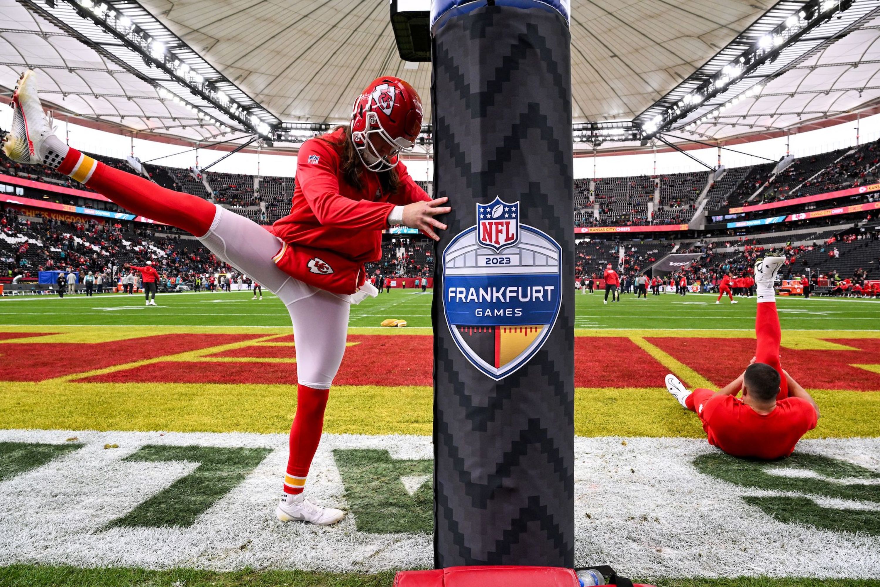 Kansas City Chiefs players warm up prior to the NFL game between Miami Dolphins and Kansas City Chiefs at the Waldstadion in Frankfurt am Main, western Germany on November 5, 2023. (Photo by Kirill Kudryavtsev/AFP Photo)