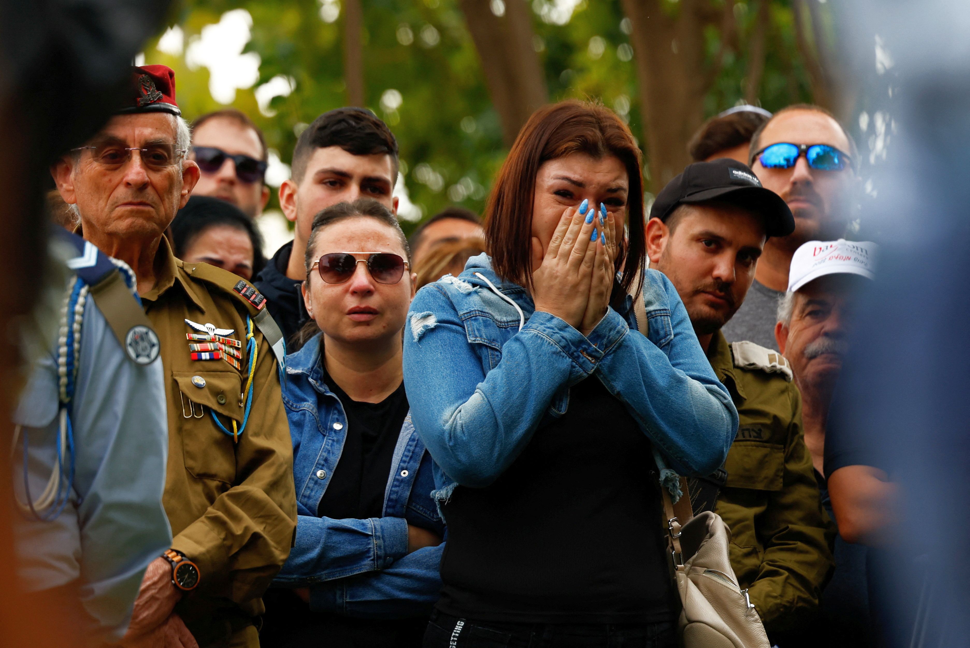 A woman reacts as friends and family mourn Master sergeant (reserves) Sergey Shmerkin, 32, who was killed in the northern Gaza Strip amid the ongoing ground operation of the Israeli army against Palestinian Islamist group Hamas, at his funeral in Kiryat Shmona, northern Israel on November 13, 2023. (Photo by Evelyn Hockstein/Reuters)