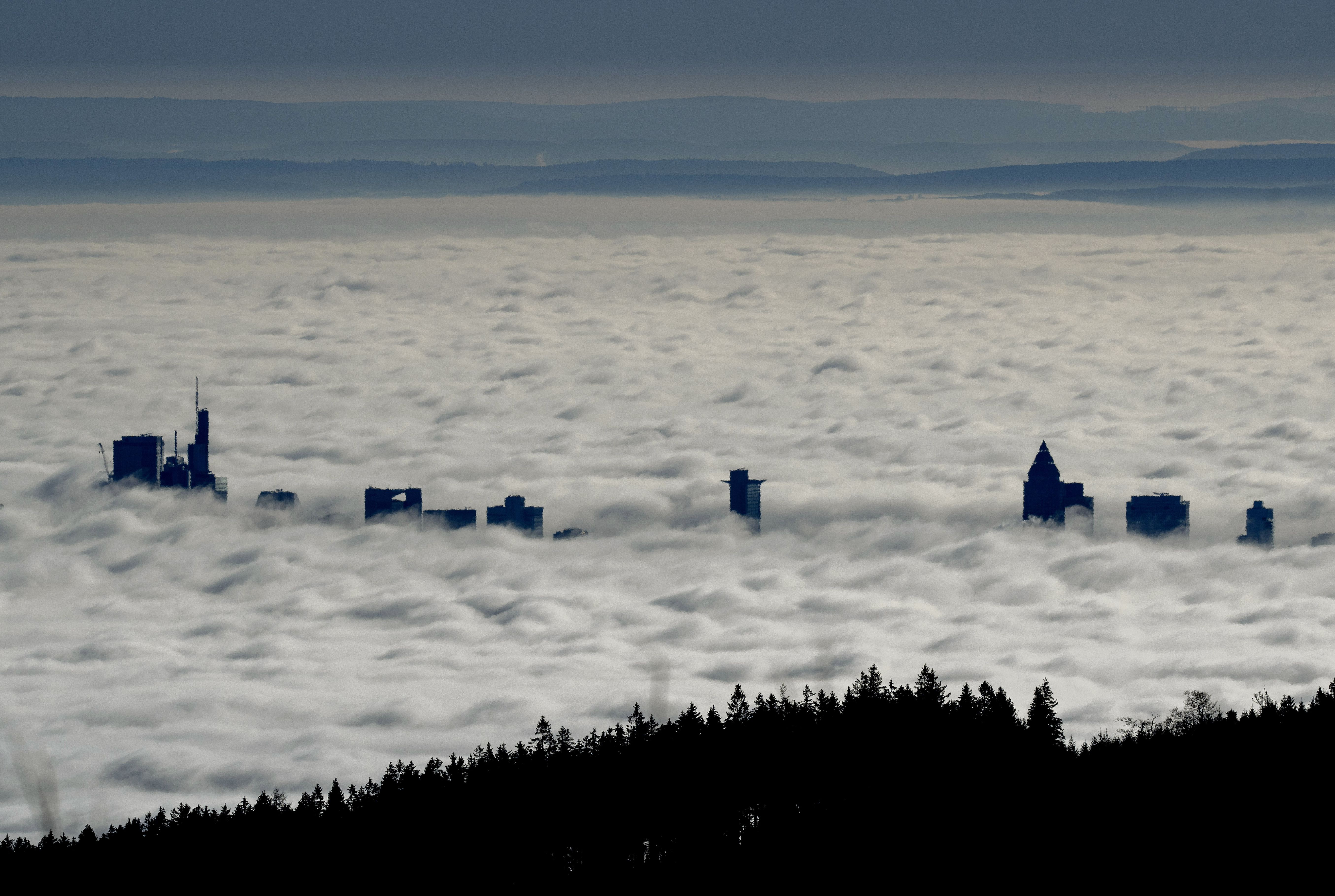 The buildings of the banking district come out of the thick fog over Frankfurt, Germany, Friday, December 27, 2024. (Photo by Michael Probst/AP Photo)