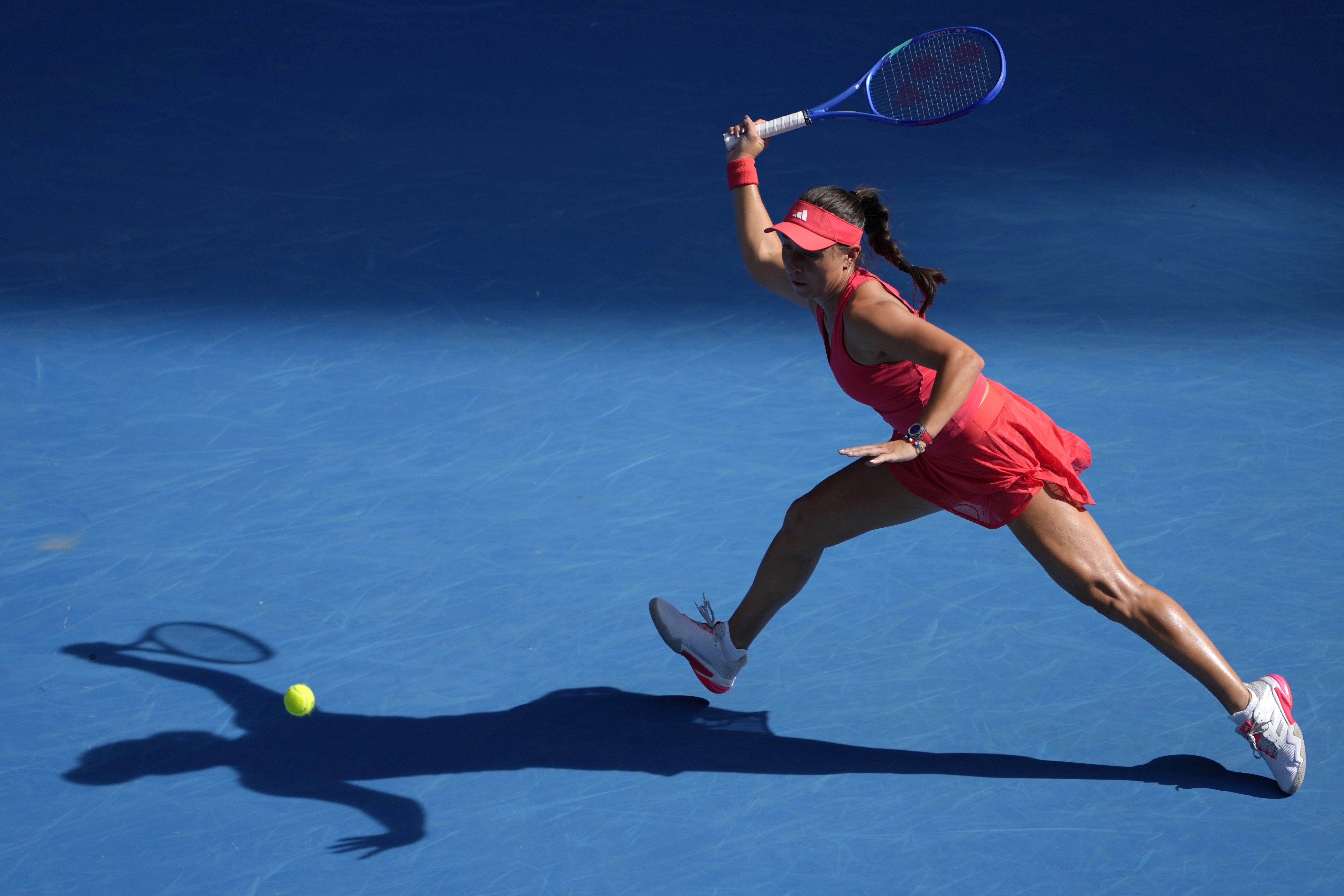 Jessica Pegula of the U.S. plays a forehand return to Maya Joint of Australia during their first round match at the Australian Open tennis championship in Melbourne, Australia, Monday, January 13, 2025. (Photo by Ng Han Guan/AP Photo)